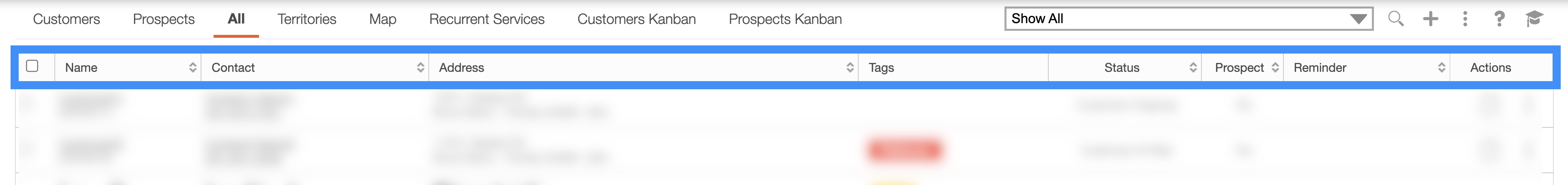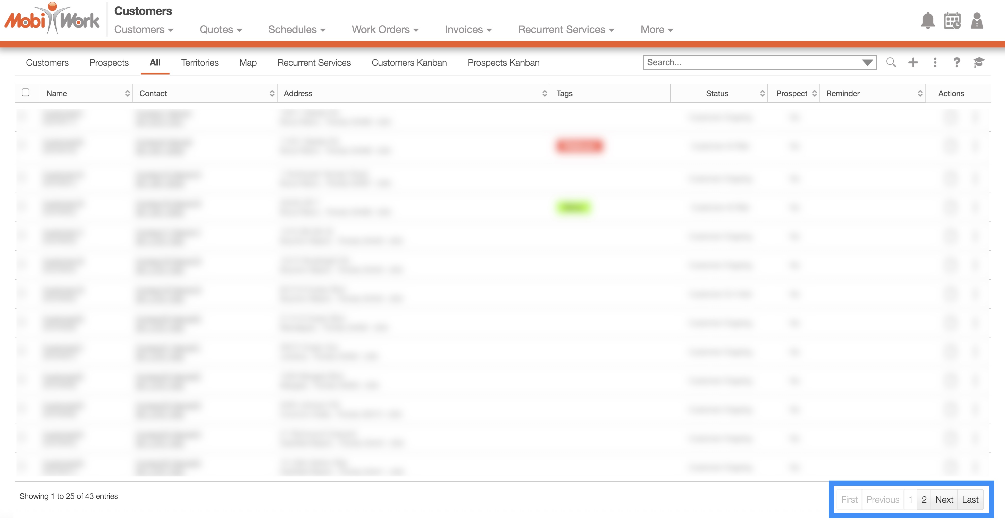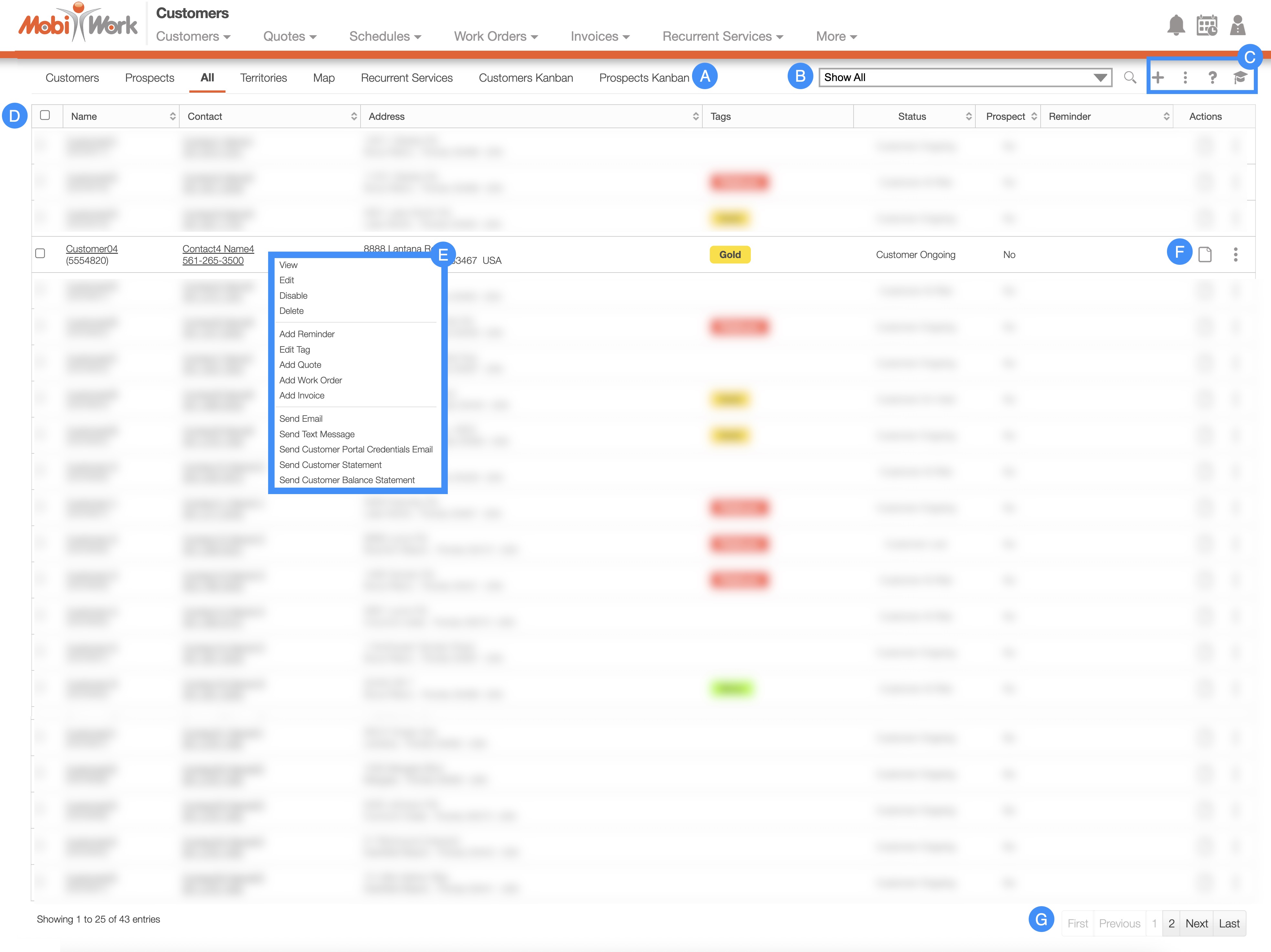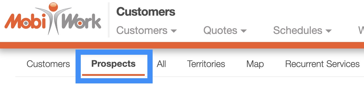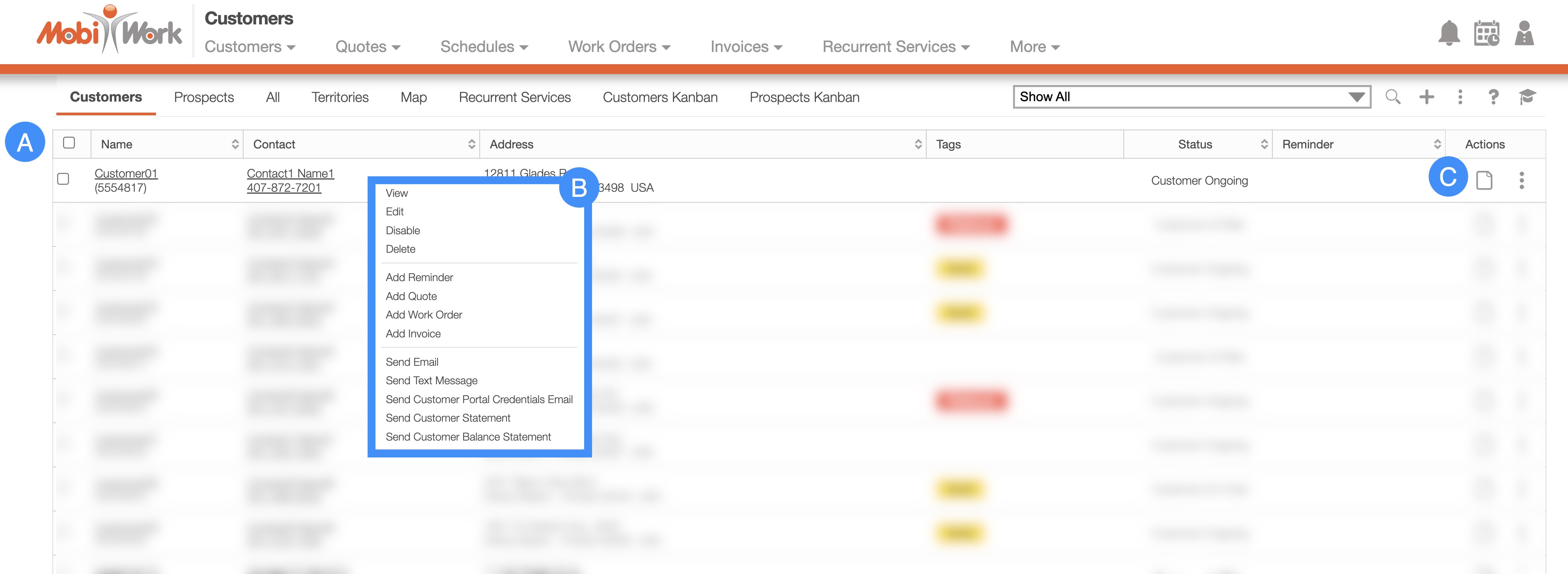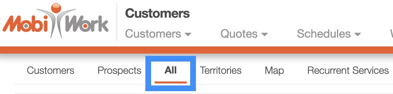After navigating to the Customers feature page from your MobiWork menu, you will be brought by default to the "Customer List (All)" tab. All your customers and prospects will be displayed on this tab.