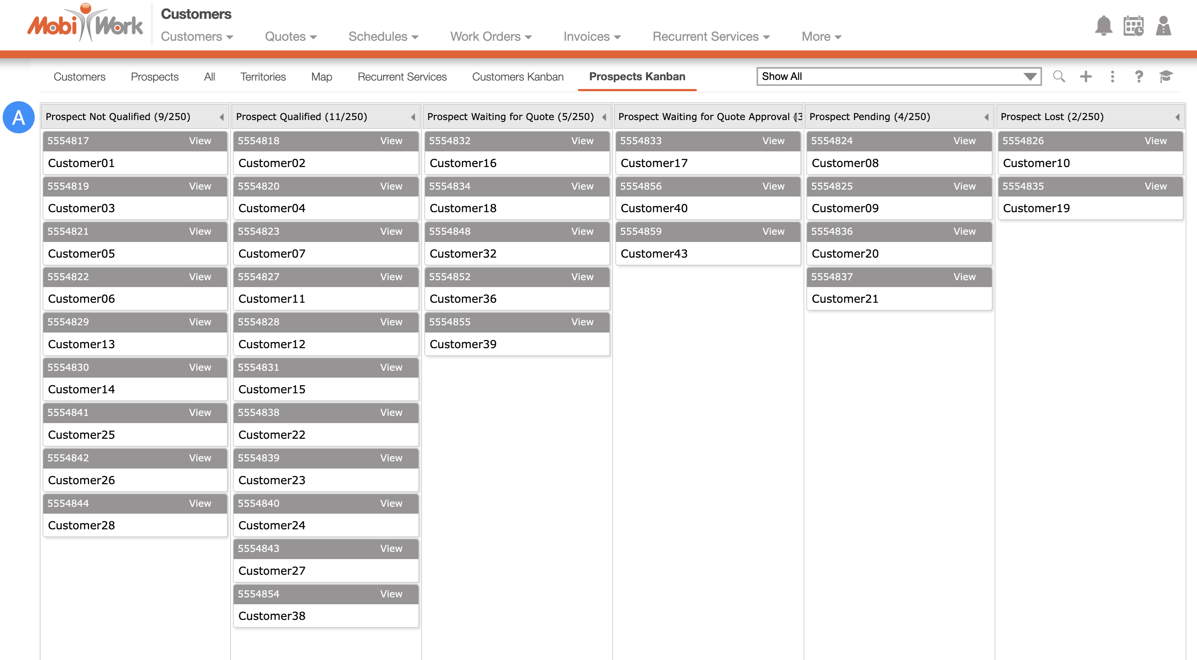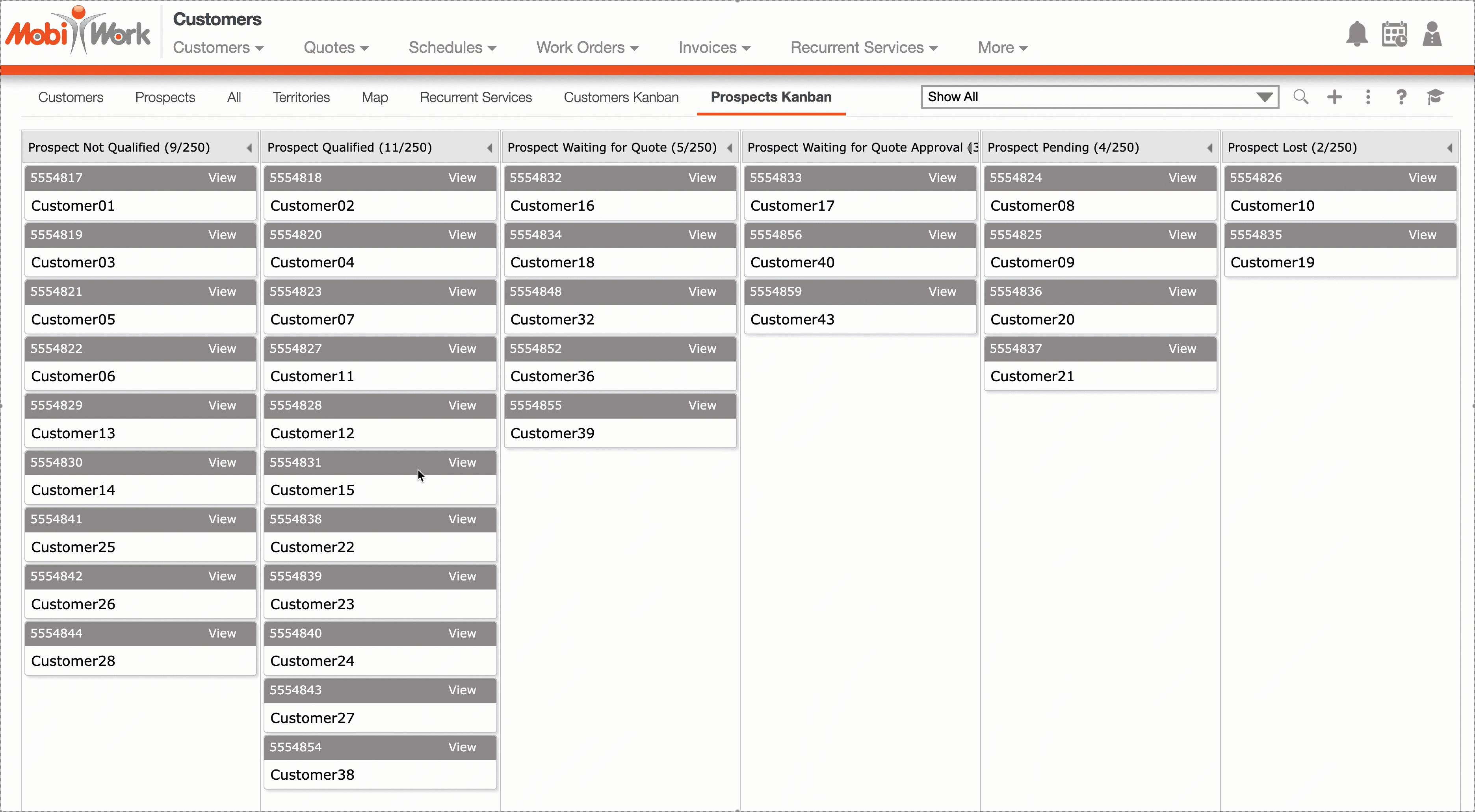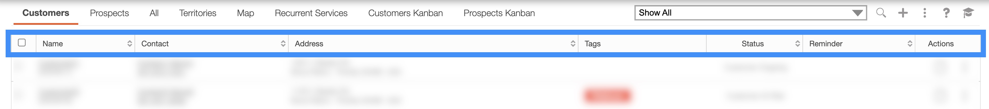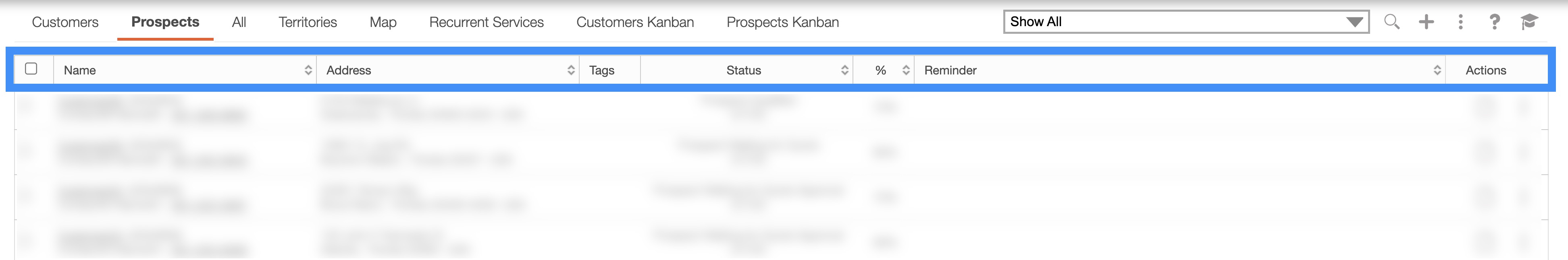 After navigating to the Customers feature page from your MobiWork menu, you will be brought by default to the "Customer List (All)" tab. All your customers and prospects will be displayed on this tab.