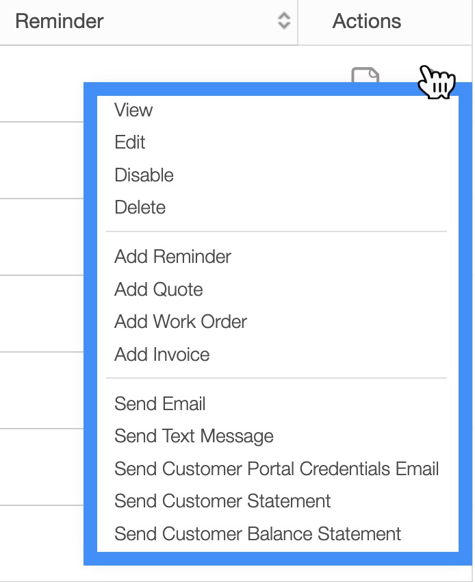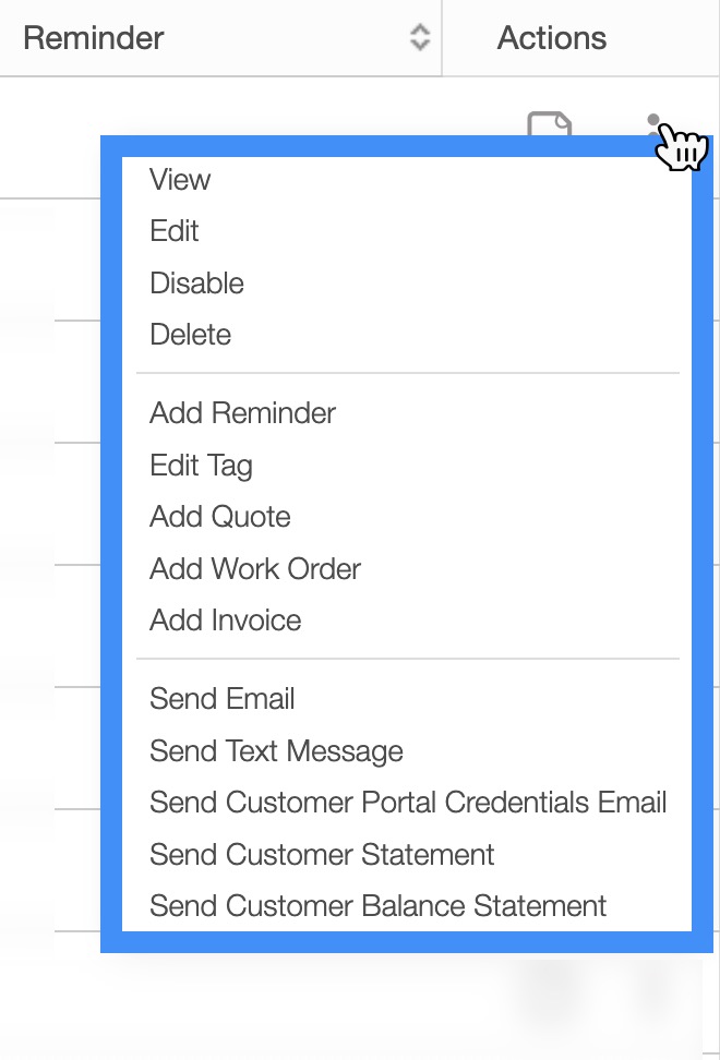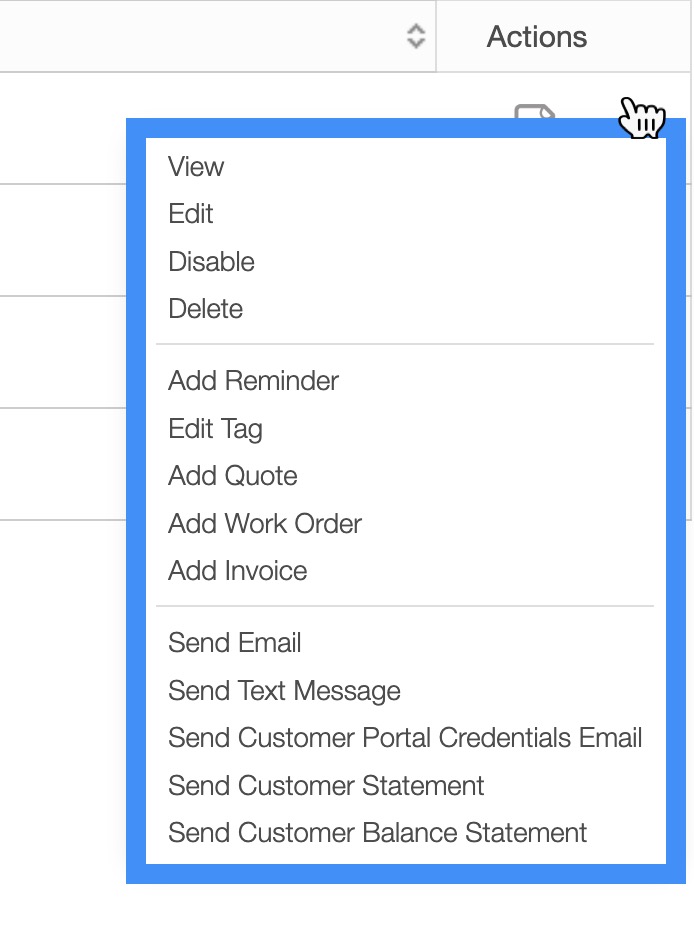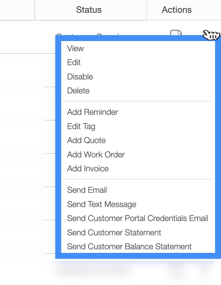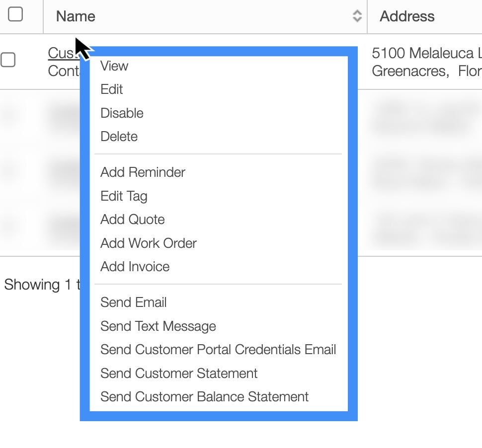 When selecting an individual prospect or customer and clicking on the Individual Actions button (the three vertical dots under the "Actions" column) you will be able to view, edit, add work order, and more to the selected customer or prospect.