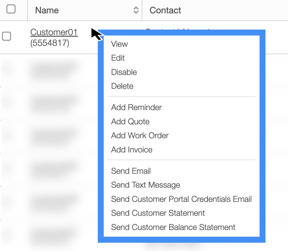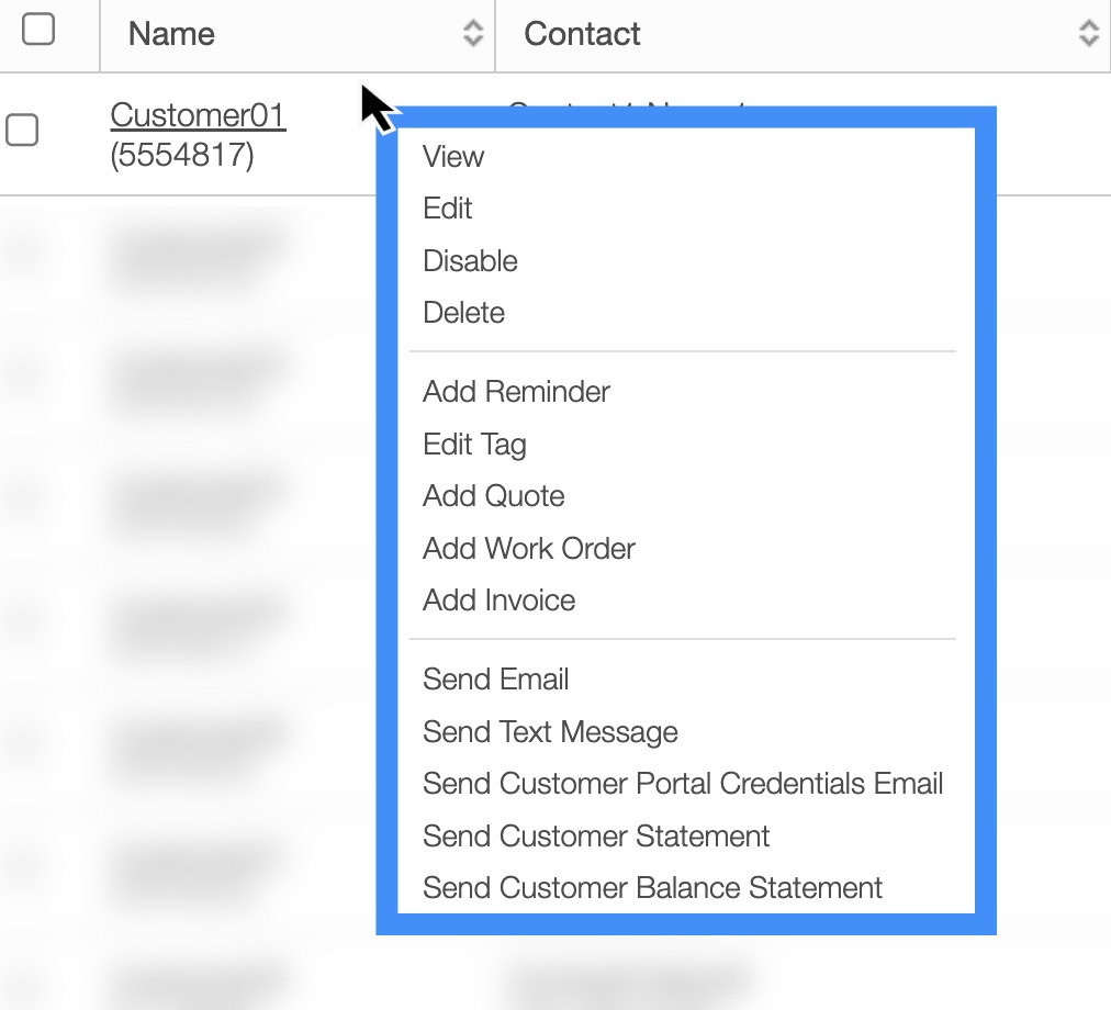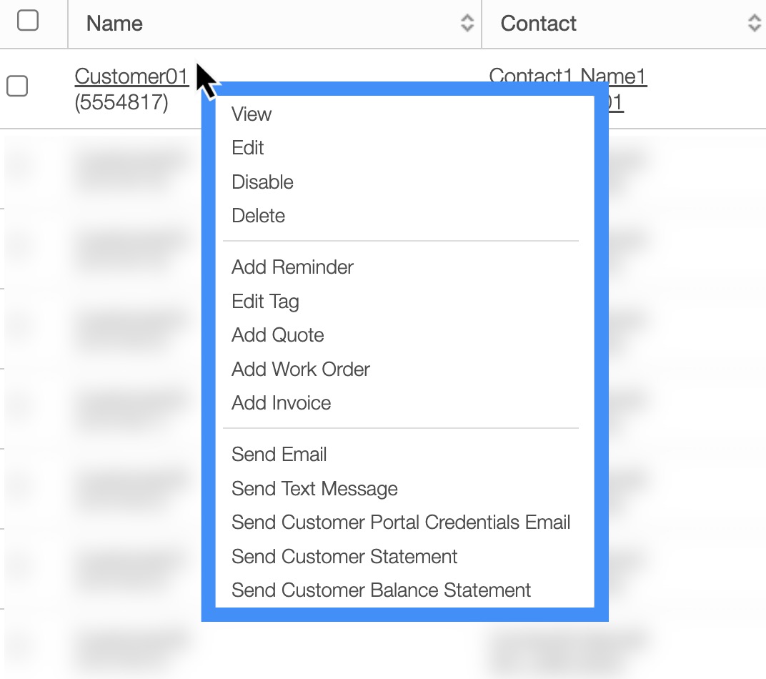 When right-clicking with your mouse on a customer or prospect in the "Customer List (All)" tab, you will be able to view, edit, add work order, and more to the selected customer or prospect.