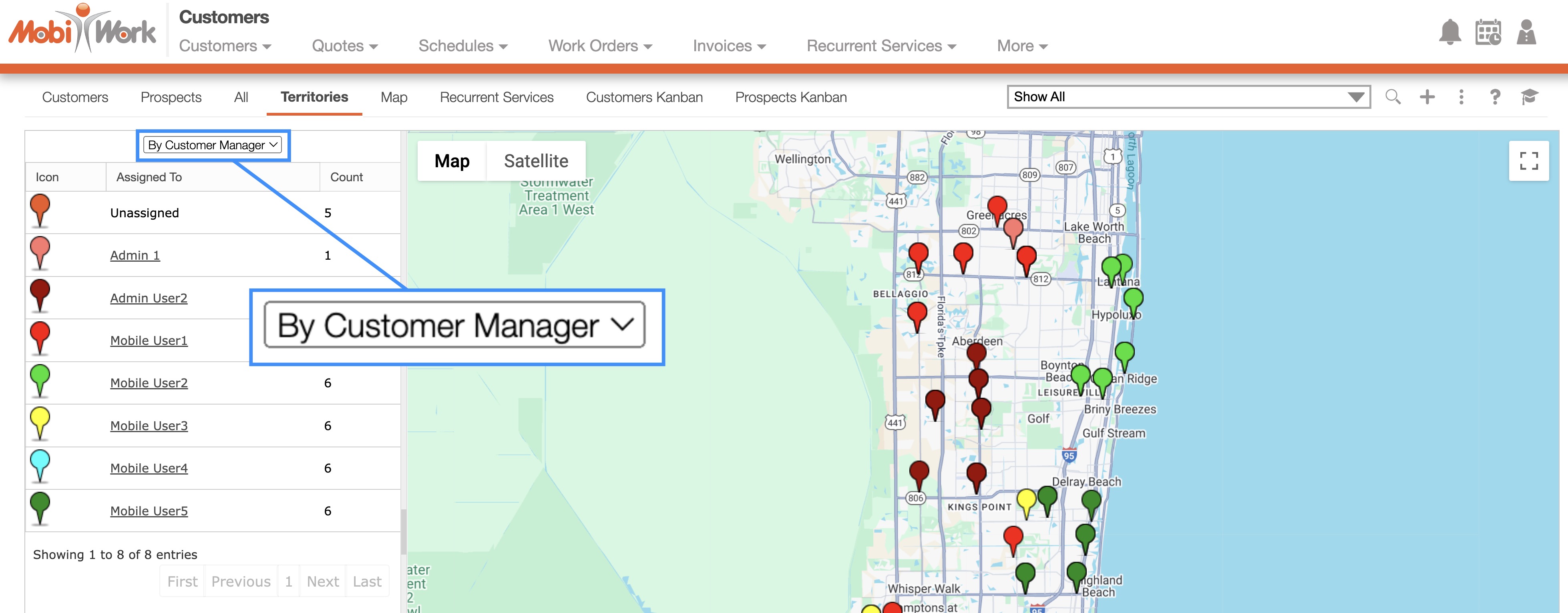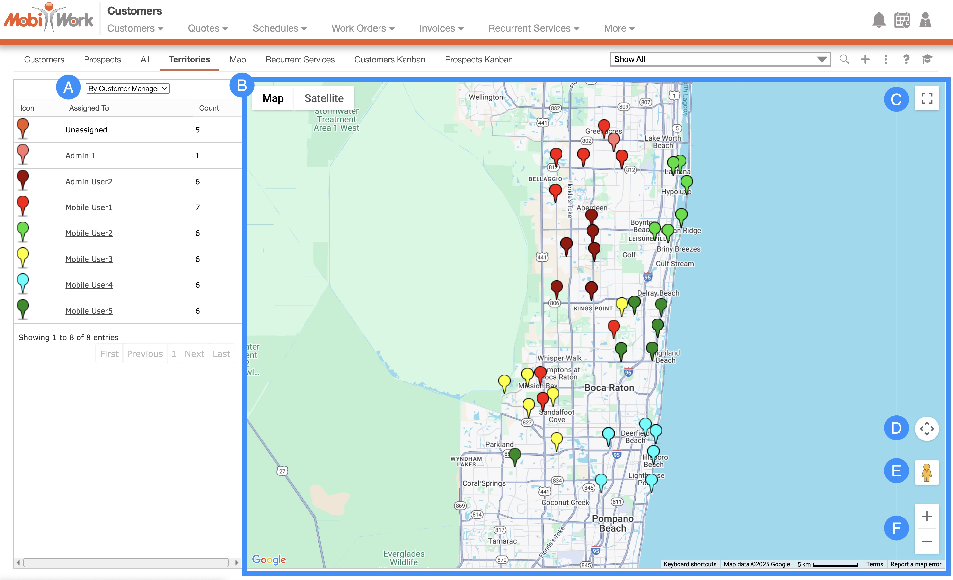 The "Territories" tab allows you to not only view your customers and prospects on a map but also view all the users assigned to your customers and prospects:
