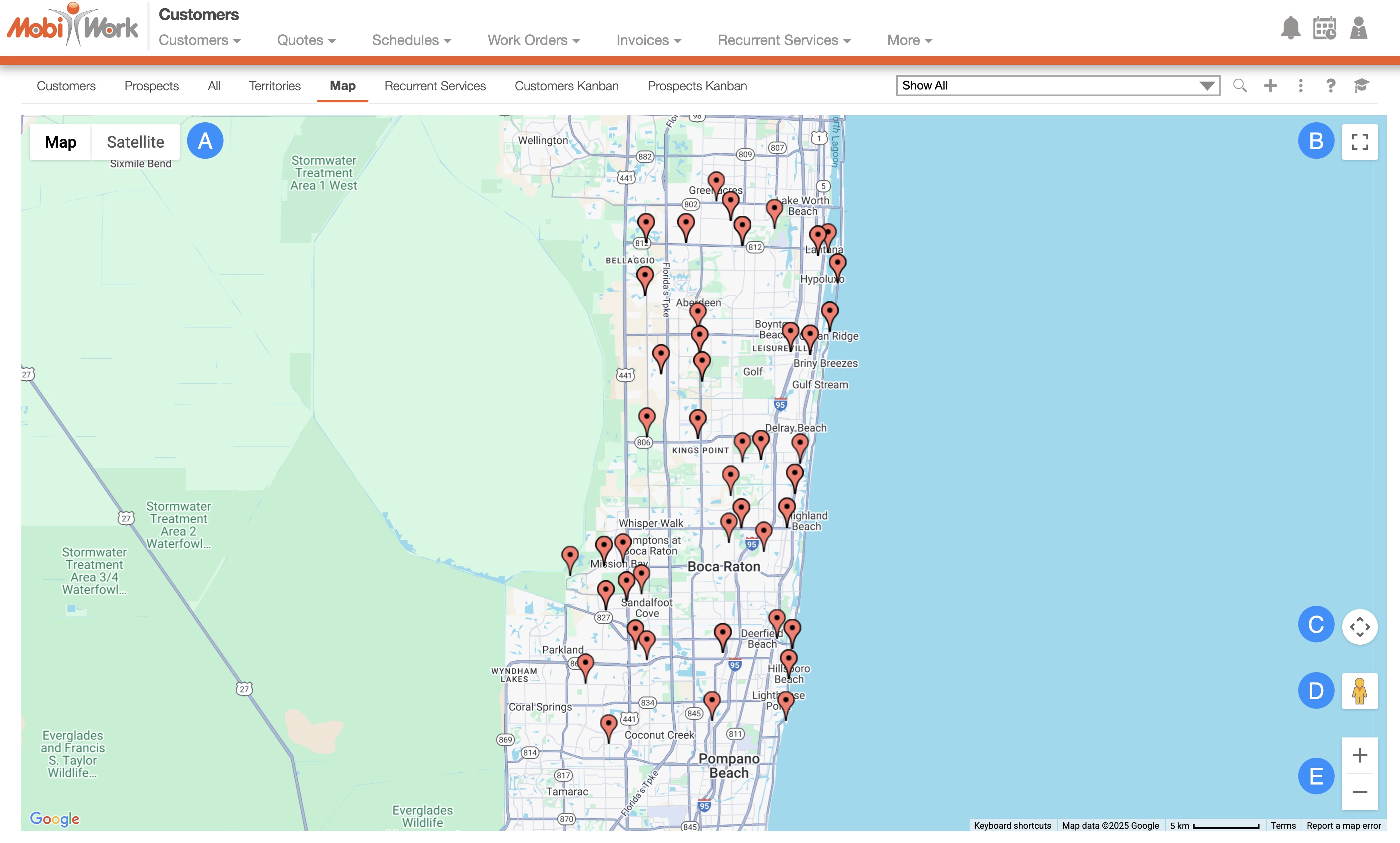 The "Map" tab will visually display all your customers (represented by pins) on a map. MobiWork utilizes the same map system that is utilized in Google Maps; the buttons and functions will work the same way: