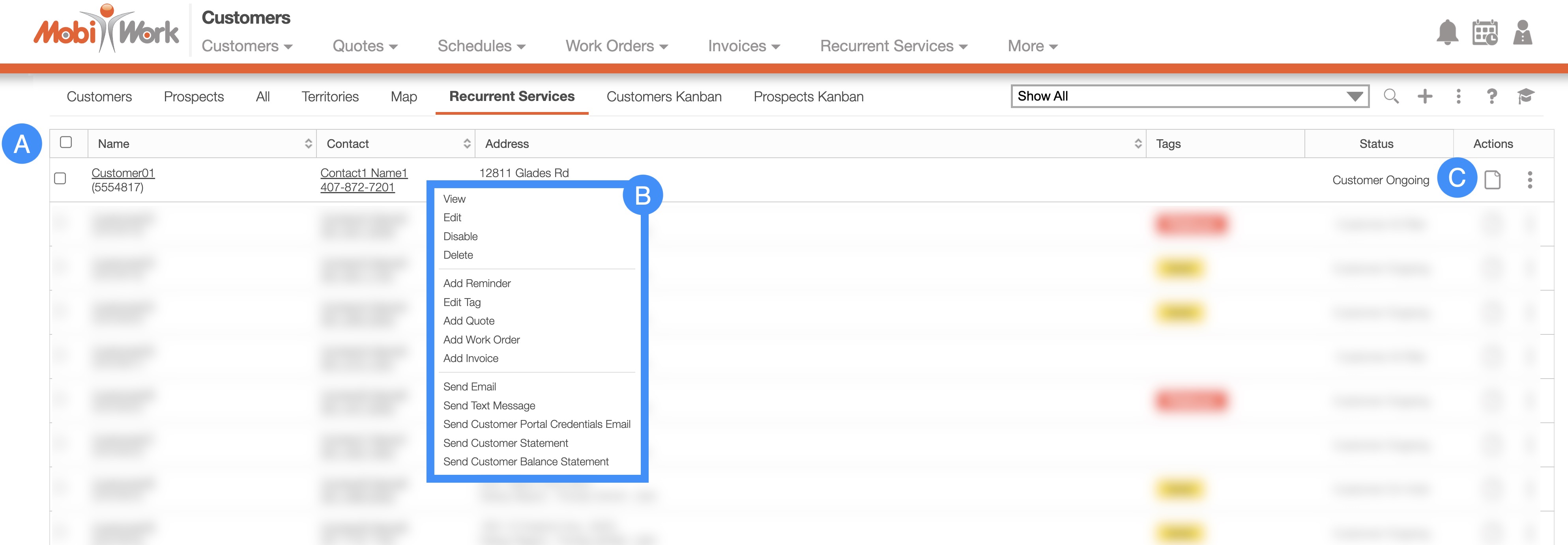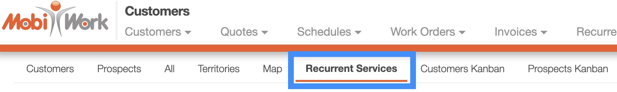 The "Recurrent Services" tab allows you to view your repeat customers in addition to editing the customer profiles, adding invoices or quotes, adding work orders, and more: