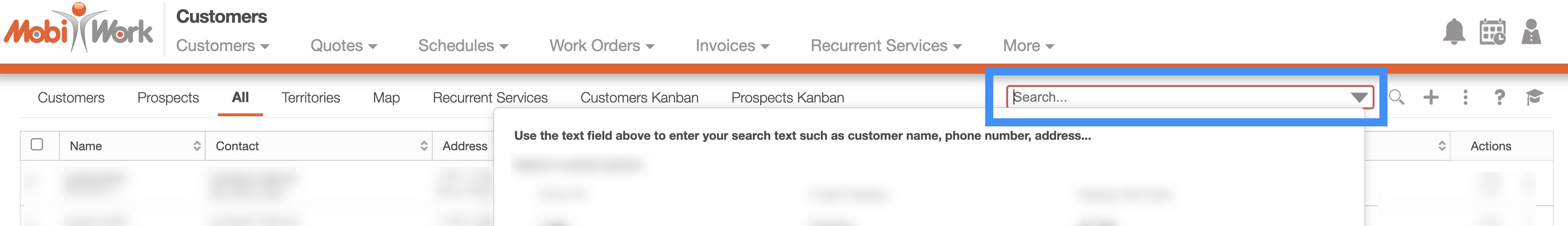 The "Customer List (All)" tab will display all the customers and prospects you have in MobiWork as well as allow you to perform actions such like, searching, editing, and adding a new customer.