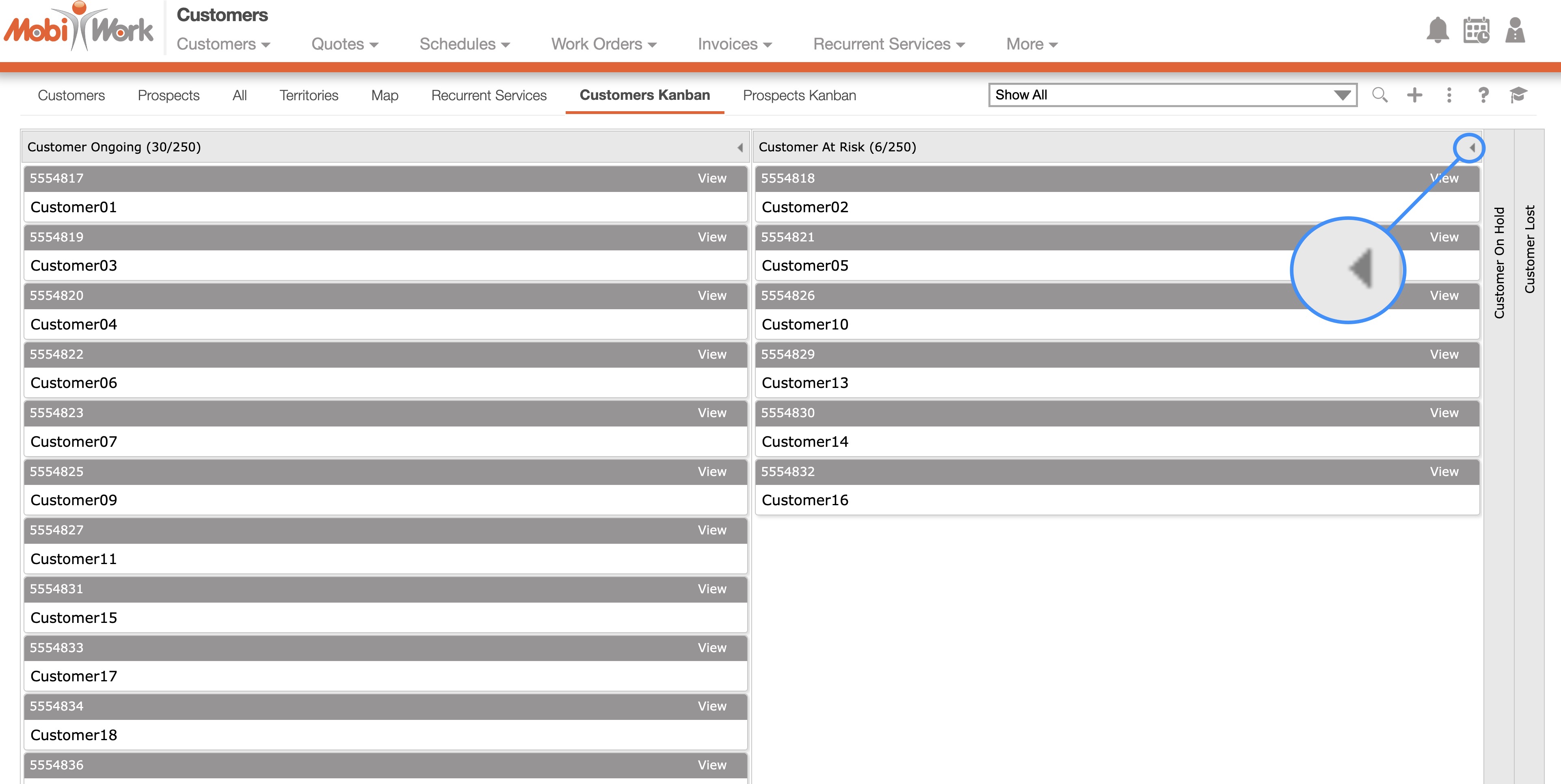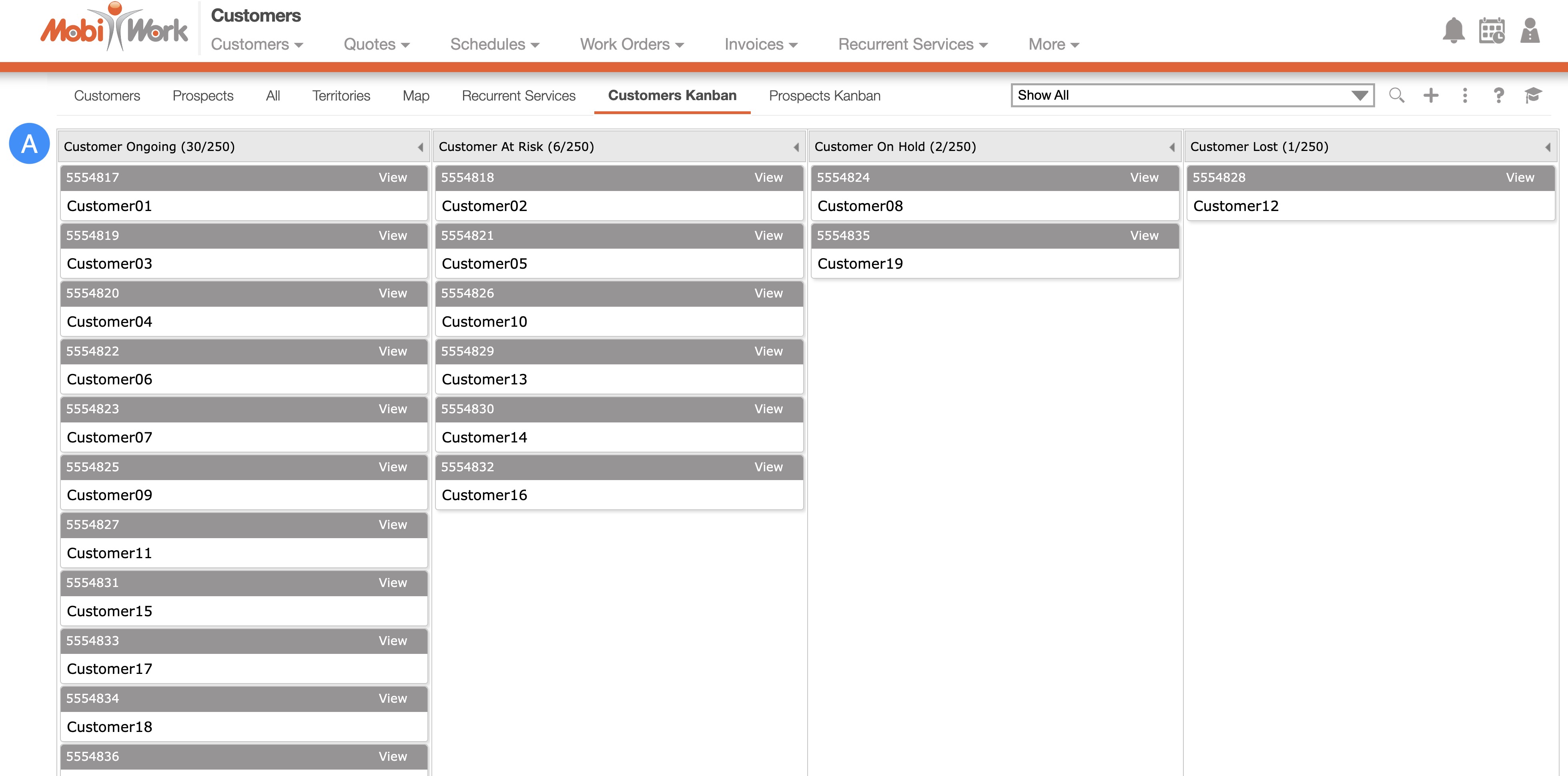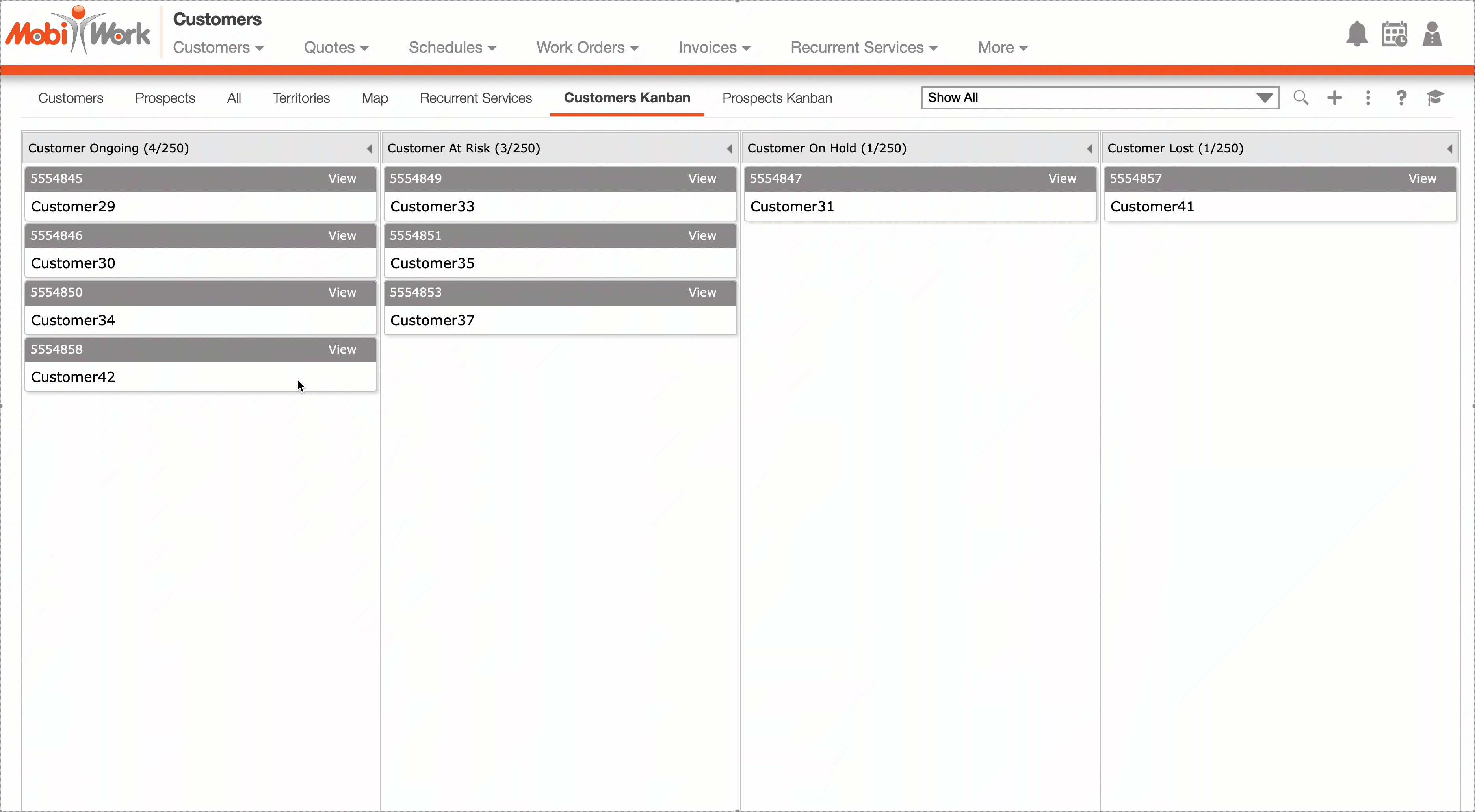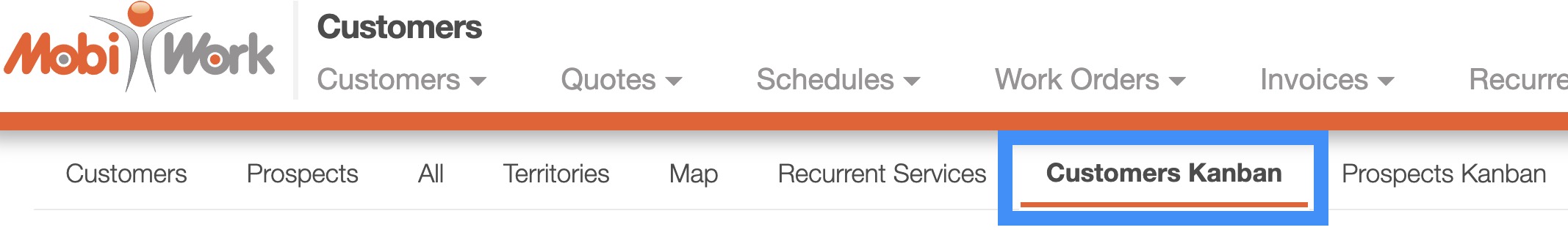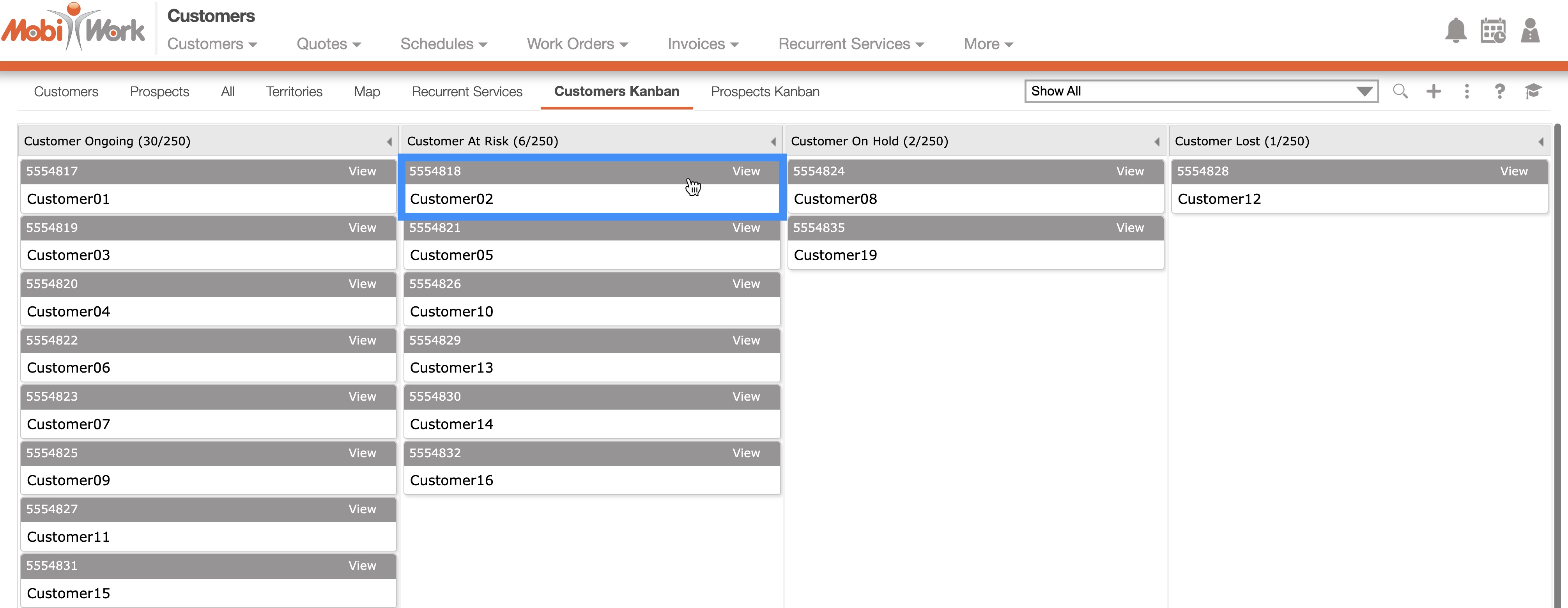 With the "Customers Kanban" tab you can easily view your customers and their statuses on a visual and interactive board: