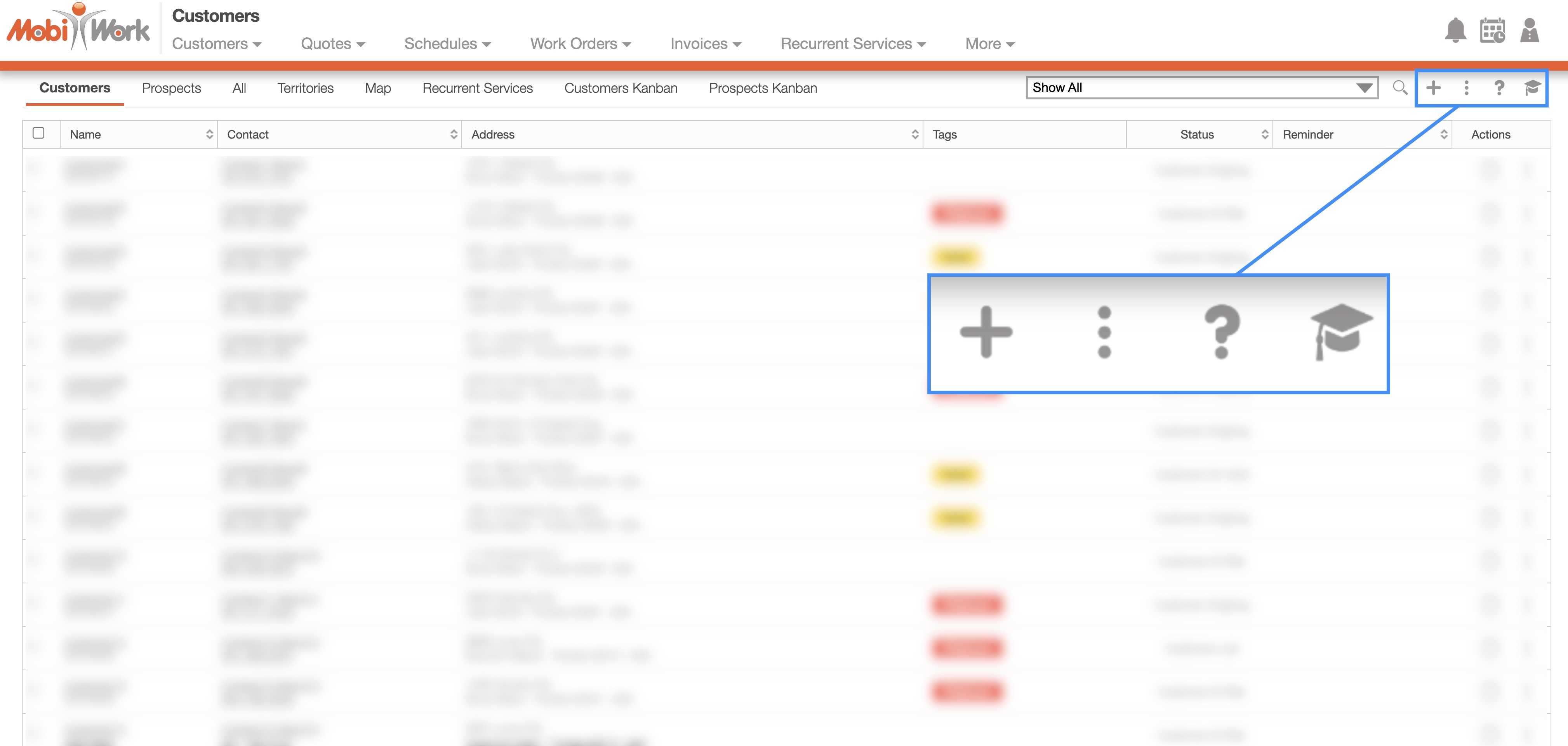 Not only can you add invoices, work orders, and quotes to your customers, but you can also set up recurring routes, schedule constraints, import/export your customers to Excel from the More Actions button. This section will guide you on how to access the Customers feature page and all of the features that it offers.