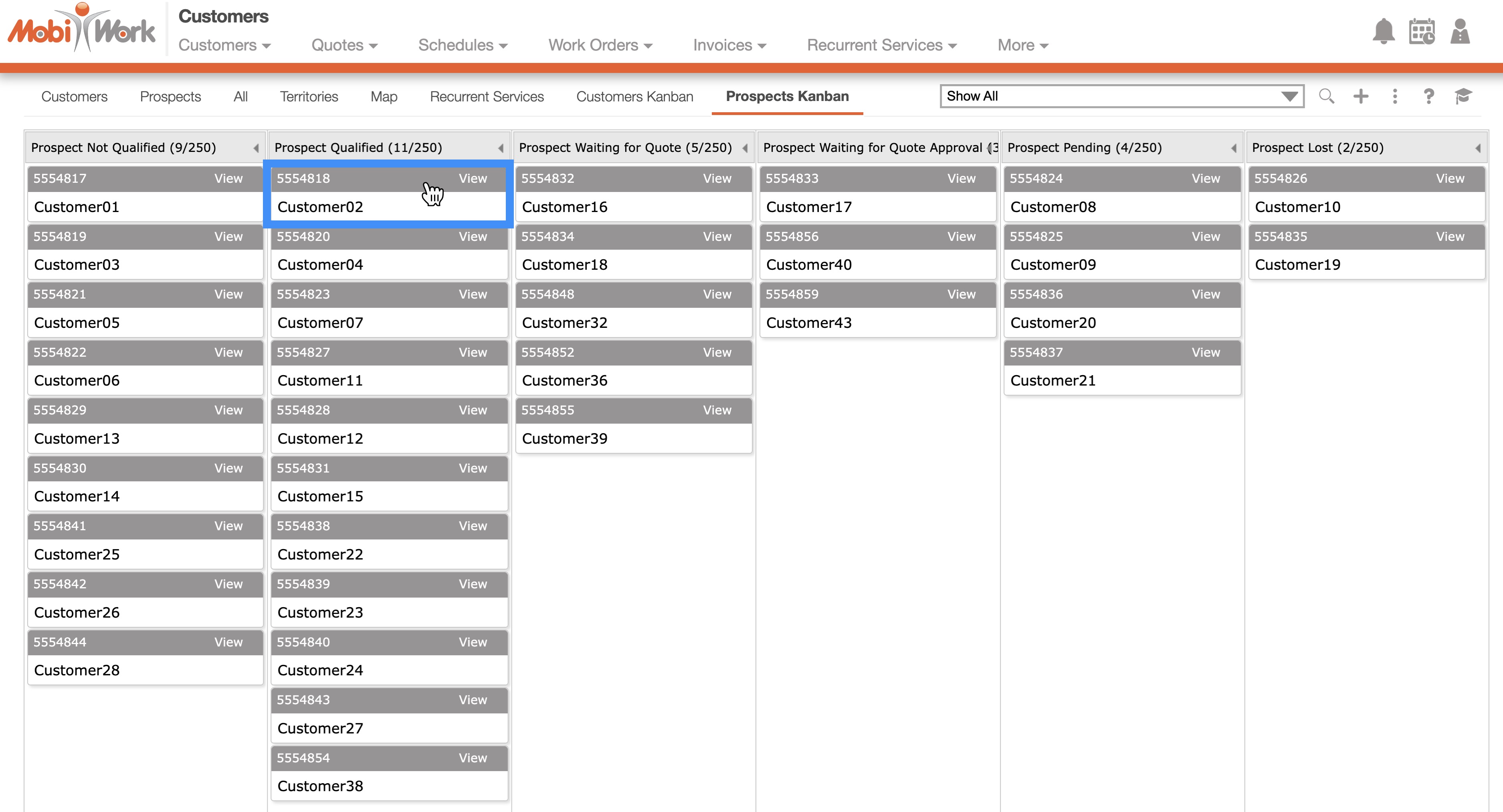 You can update the status of a selected customer by dragging & dropping the customer to the desired status column: