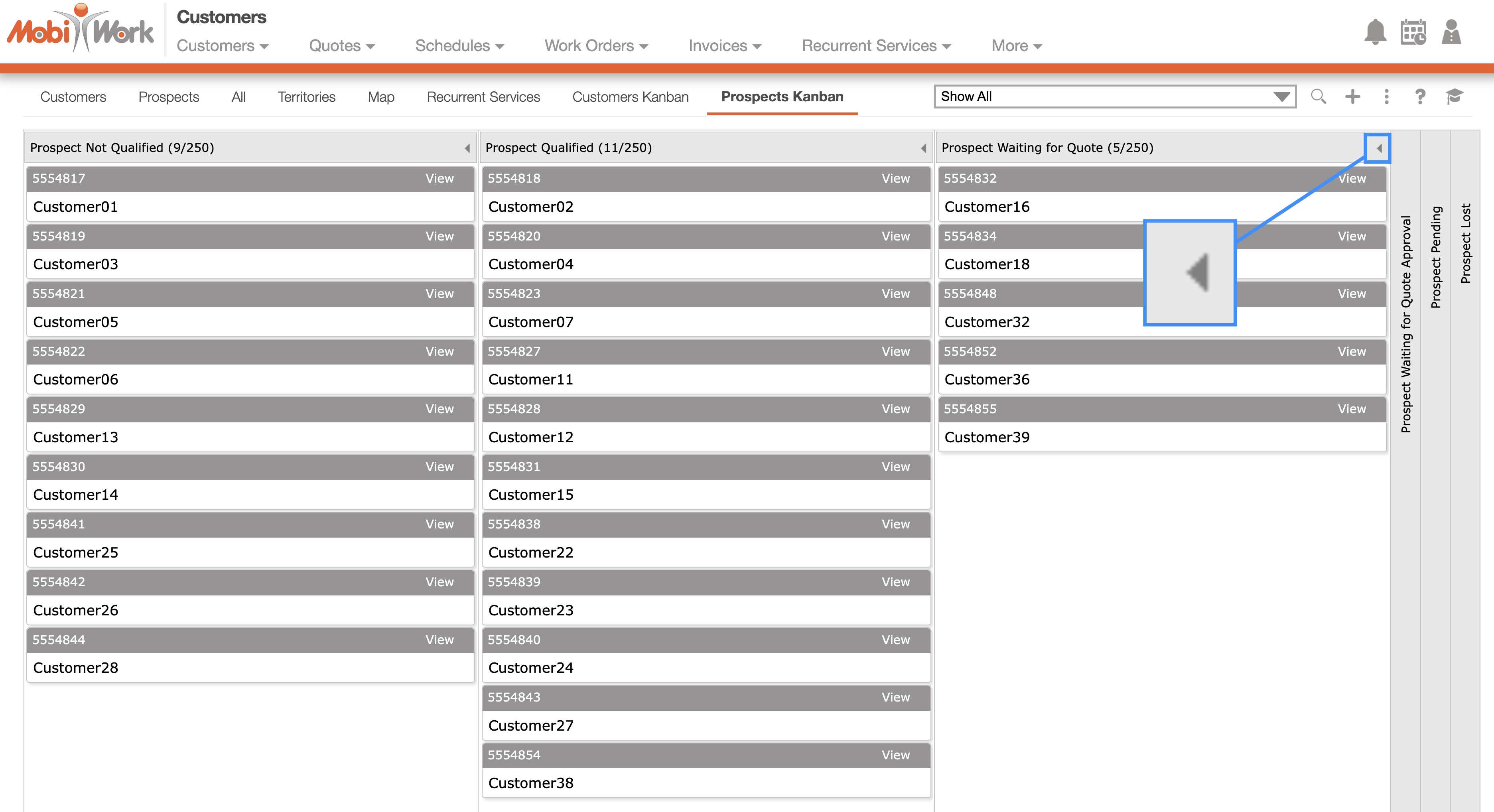 The columns in the "Customer Kanban" tab will be organized by the customer status. For more information about the customer status, please see the New Search section: