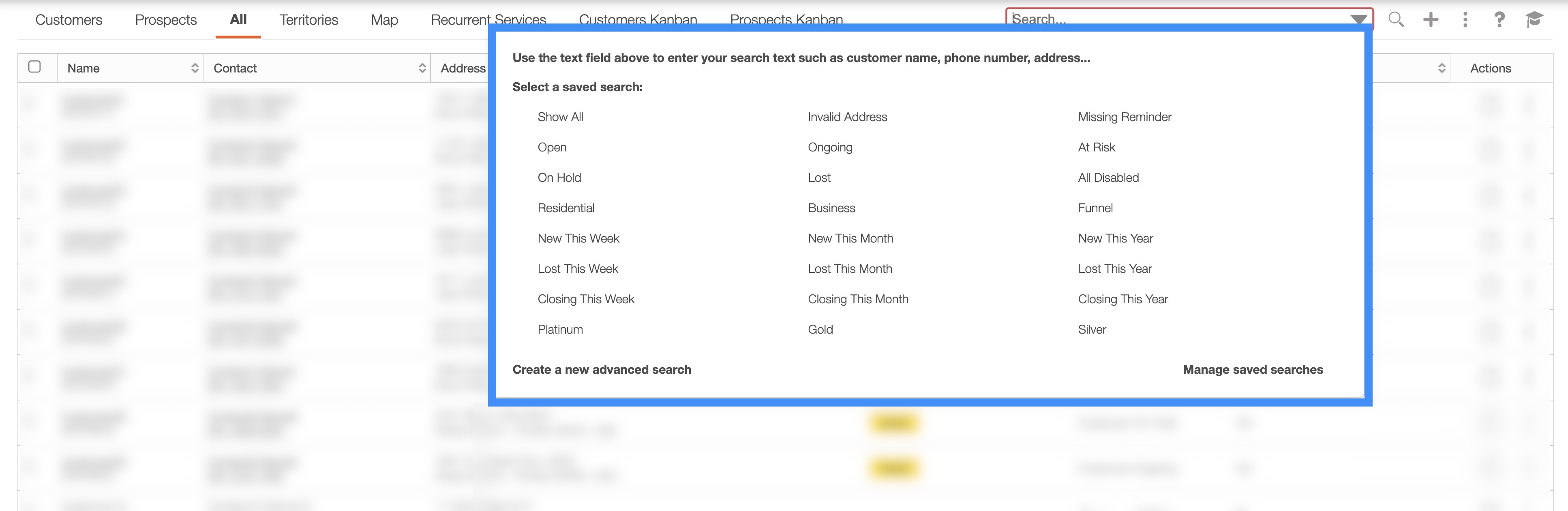 You can type in the search bar (free-text search) to locate a specific customer. Once you click in the search bar, the search drop-down menu will automatically appear. You can use the search drop-down menu or continue typing your own search parameters: