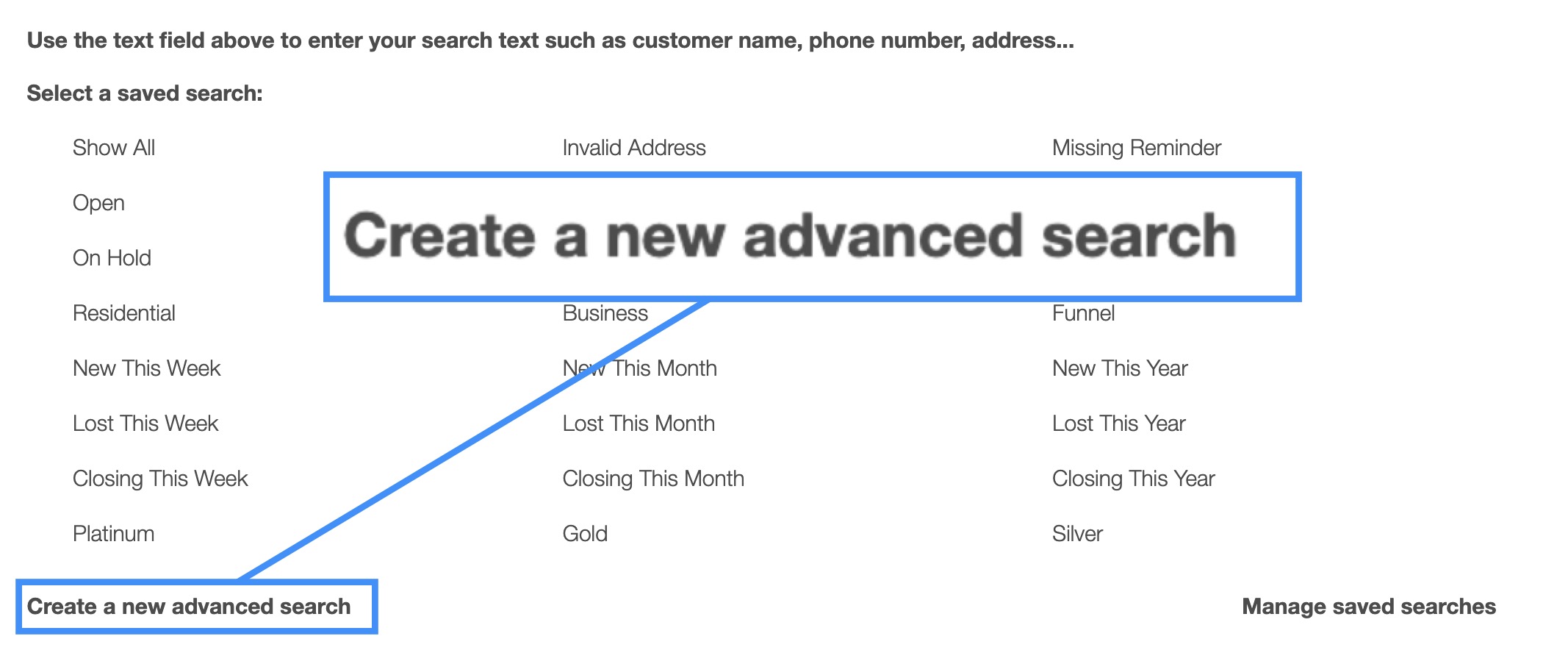 By default, MobiWork provides a number of saved searches for you to use which are organized by status and date (e.g. Residential, Business, Open, etc.):