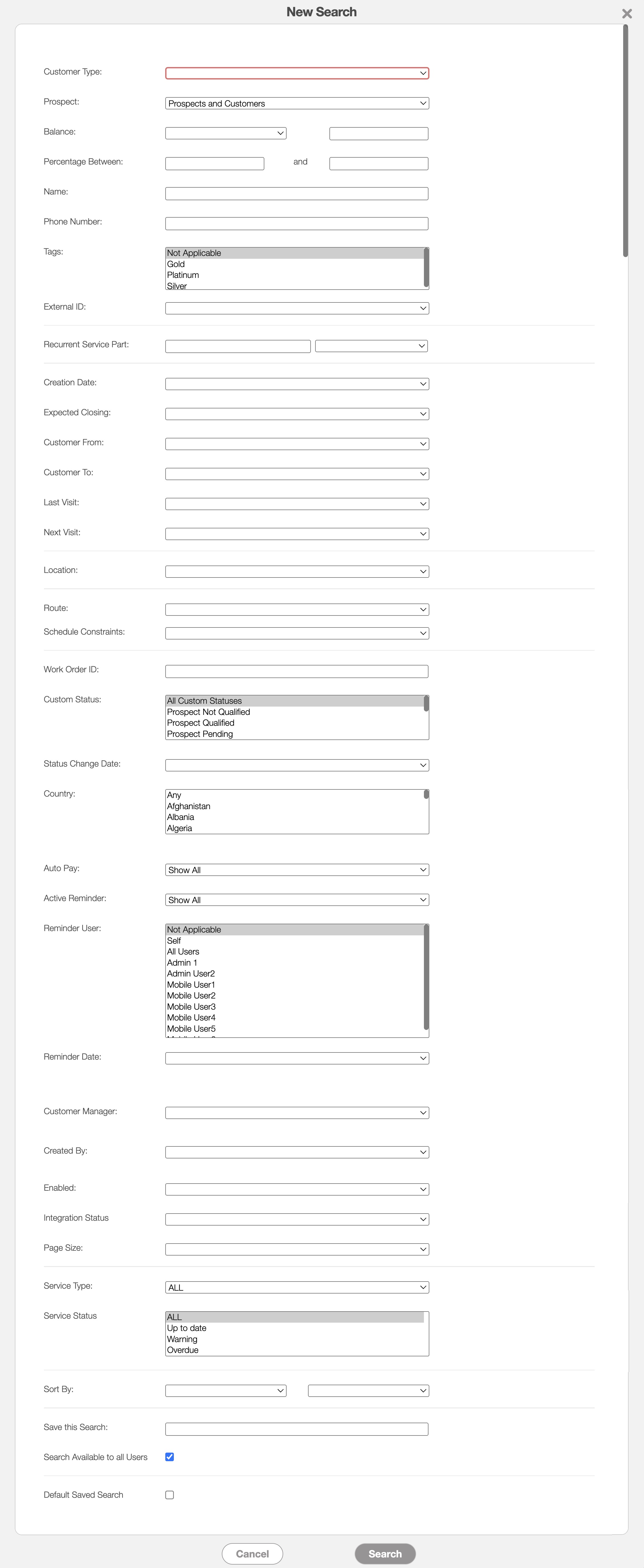 | "Prospect" | Specifies if the search should include prospective customers, customers, or both. | "Balance" | Allows you to search for customer balances that are equal to, greater than, or less than a specified amount, as well as to search for all balances. |
