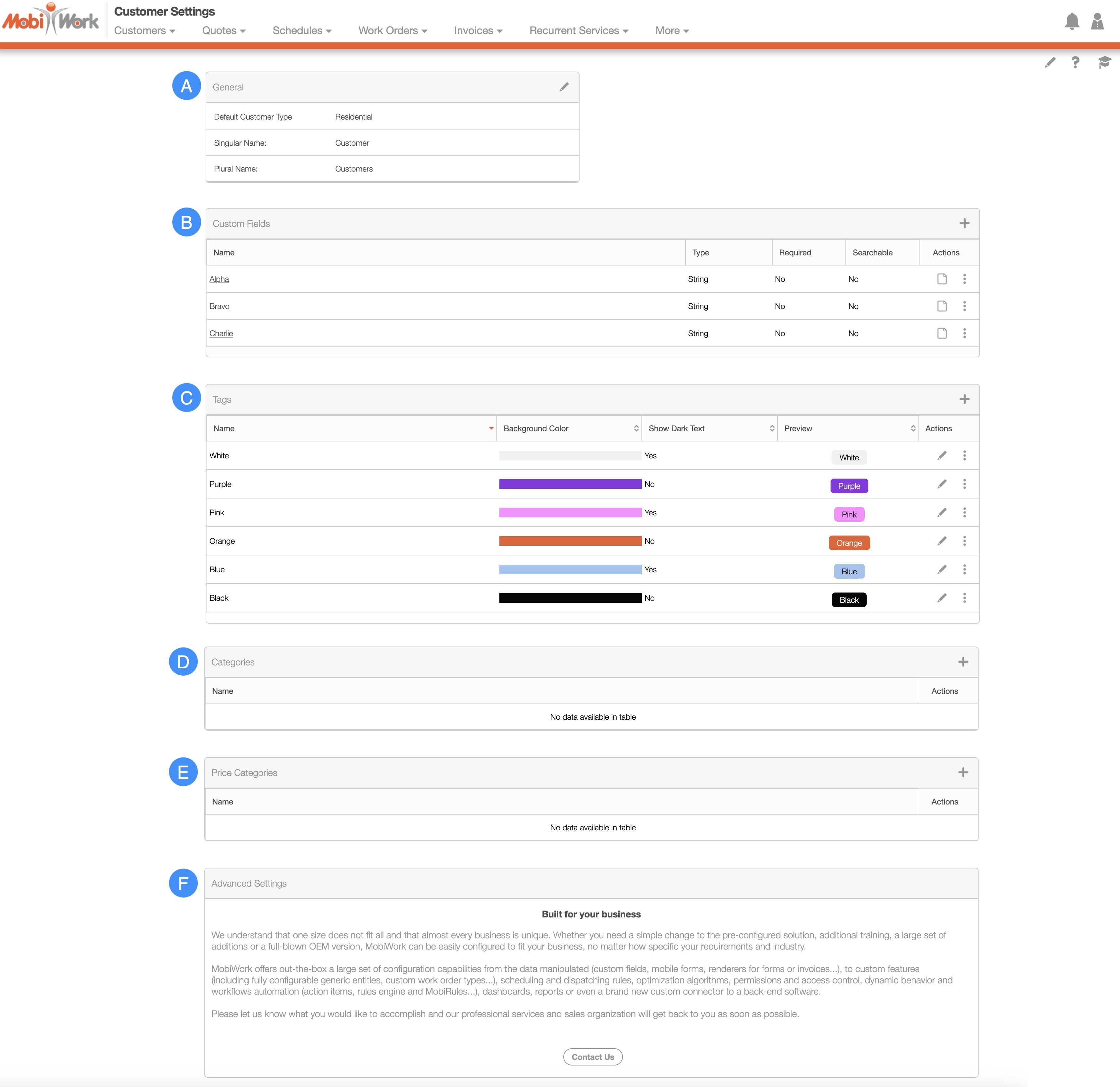 Our Customer Settings page offers you a world of possibilities for customizing your customer interactions. From tags and categories to price categories and custom fields, the power to shape your customer database is in your hands. This page will help revolutionize your customer management within MobiWork.