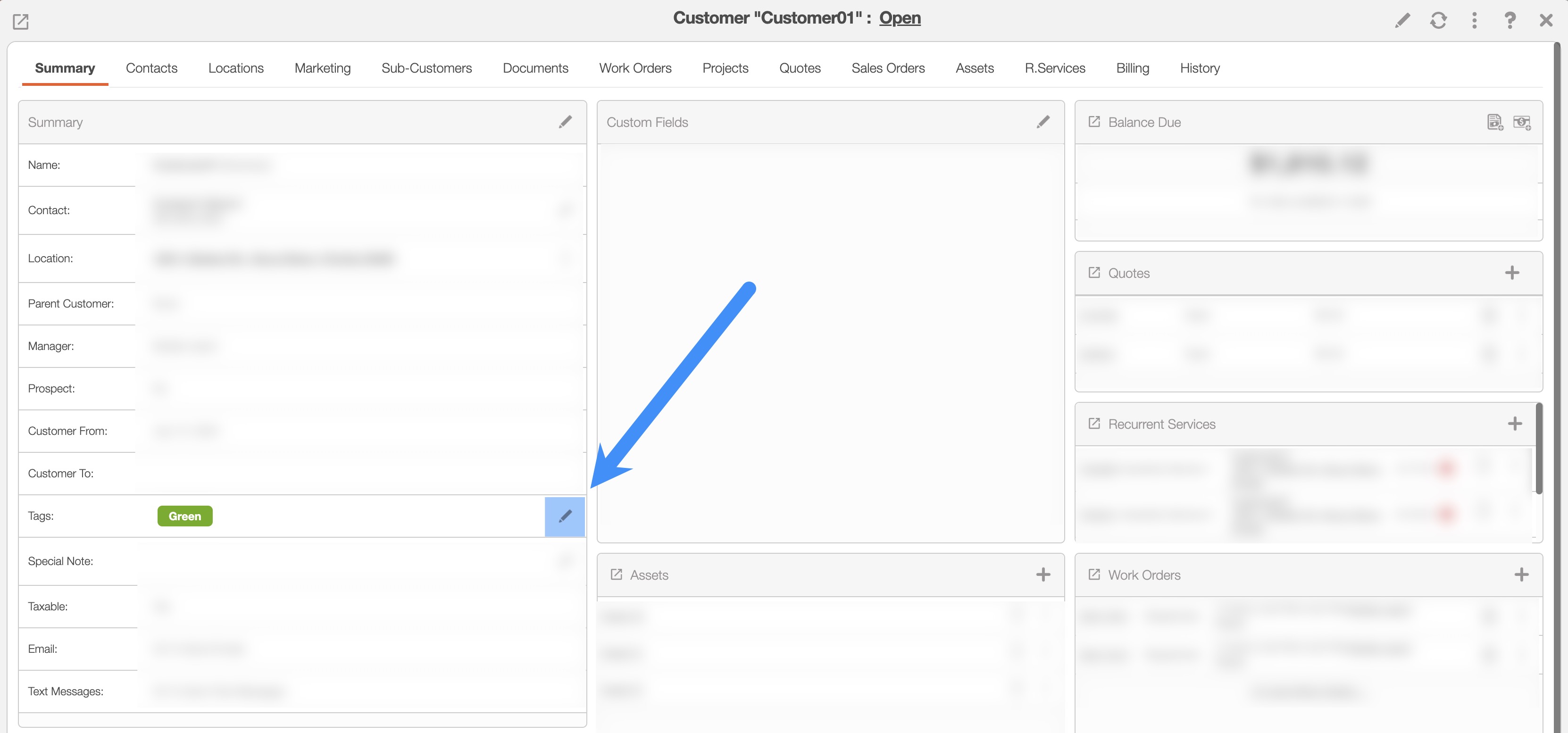 To add a new tag to your customer, open the View Customer pop-up window and in the "Summary" panel click on the Plus Sign for the "Tags" column; if you have already added tags to your customer, this icon will turn into a Pencil icon: