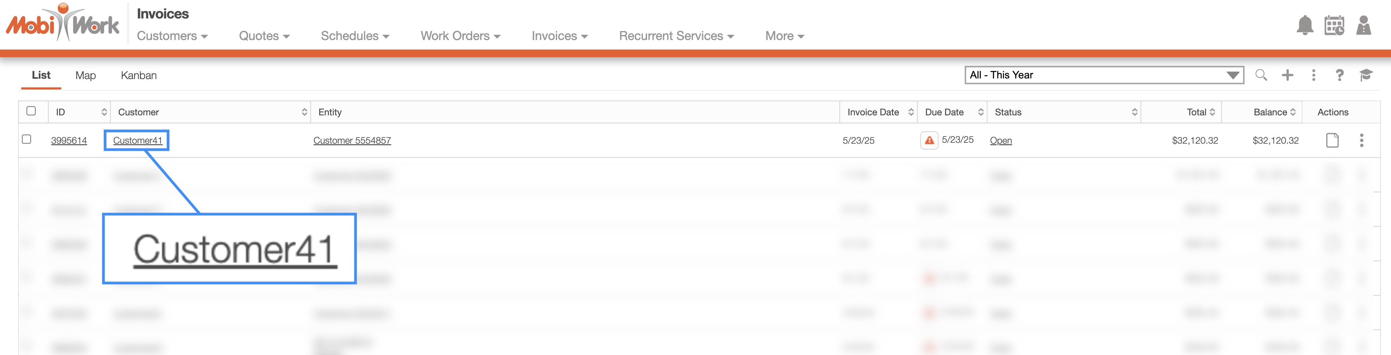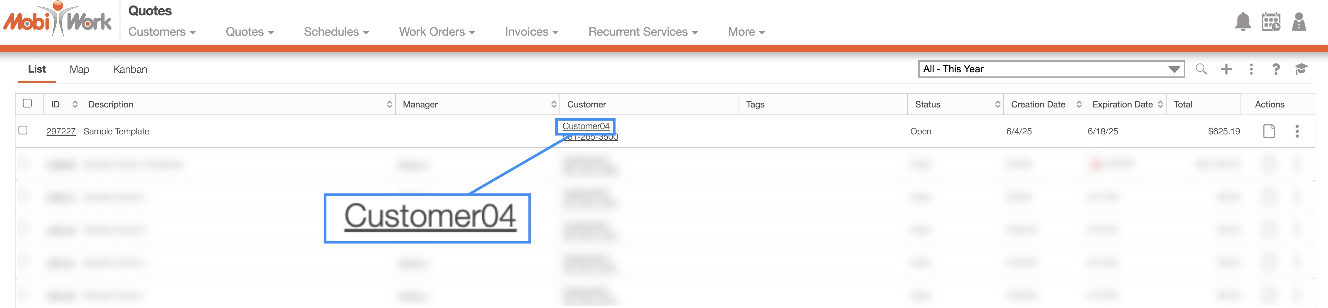 There are several different ways you can access the View Customer pop-up window in MobiWork. Any time you see a hyperlinked customer or company name, you can click on it to see the pop-up window.