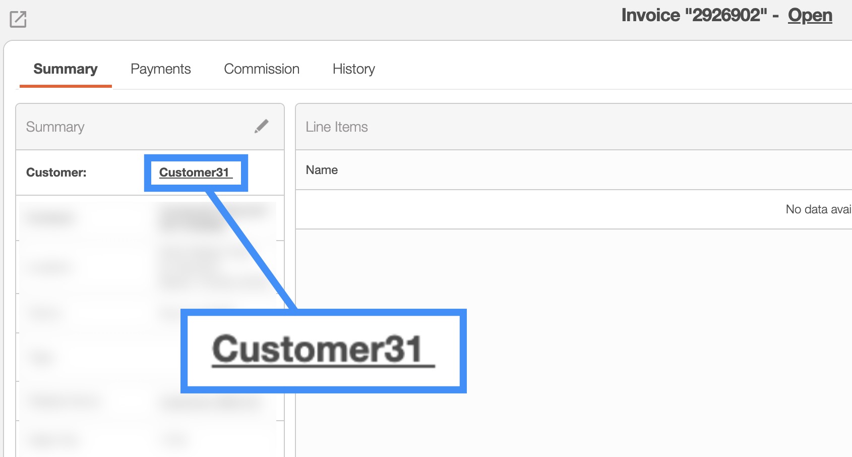 You can also access the View Customer pop-up window from the View Invoice pop-up window. For the different ways to access this pop-up window, please see the View an Invoice page. Once you are on the View Invoice pop-up window, click on the customer's name: