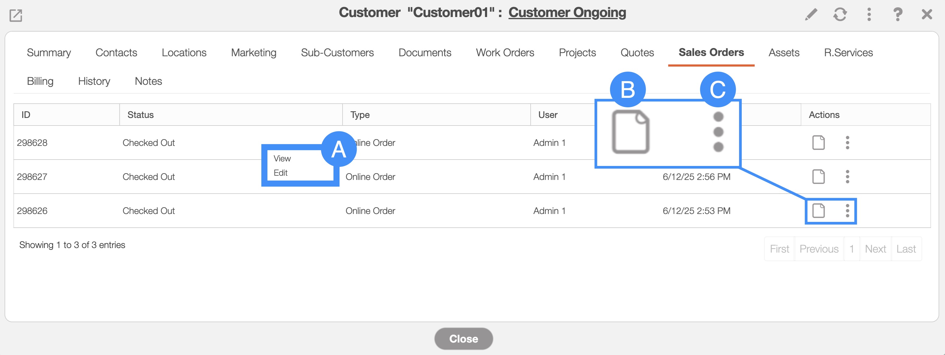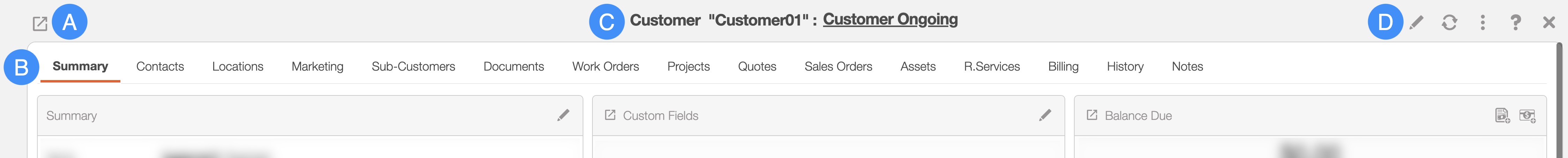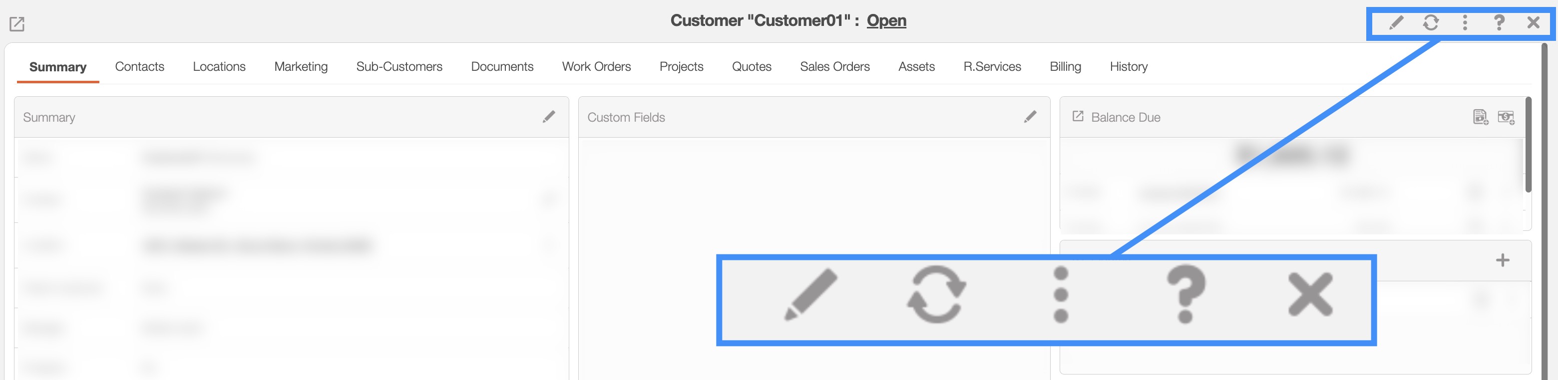 The Customer's Upper Right Corner Actions can be found in the top-right corner of the View Customer pop-up window. These actions are located in this section, regardless of the tab you are on: