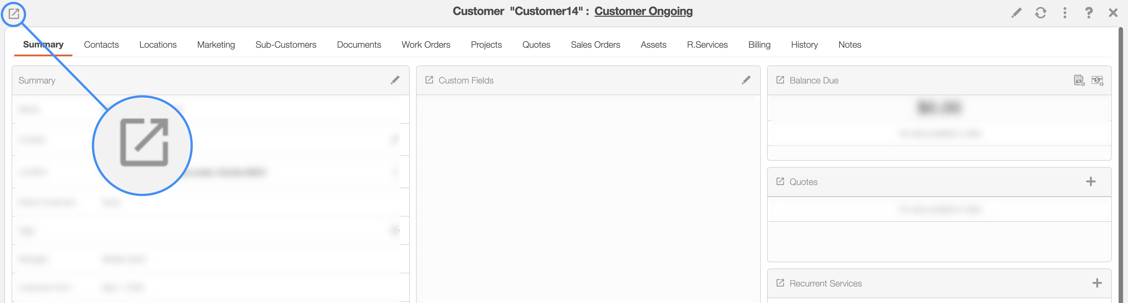By clicking on the upwards arrow in the left-hand corner, you can expand the View Customer pop-up window so that it is full-size: