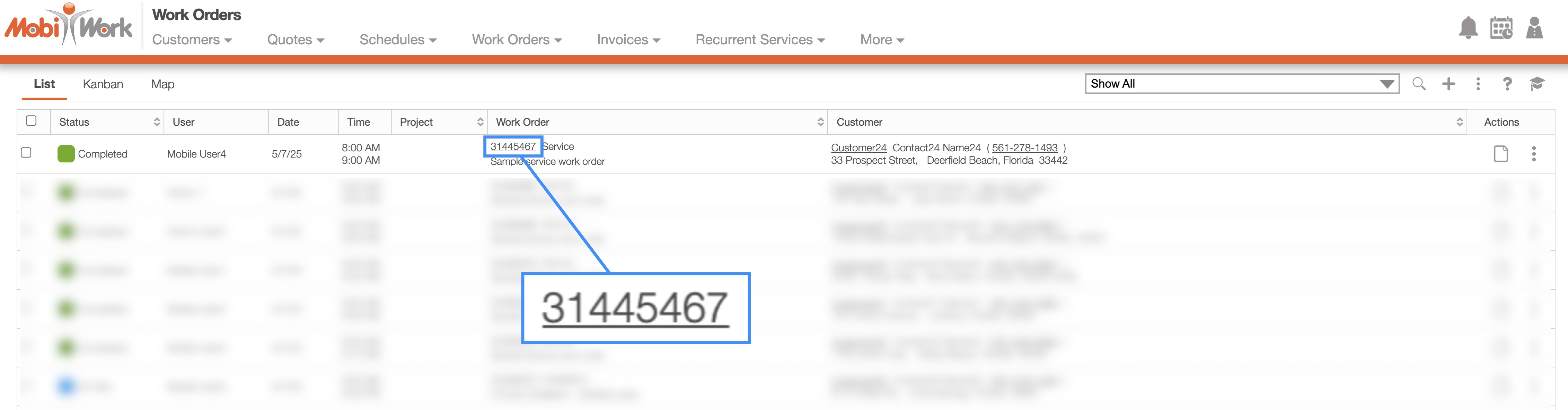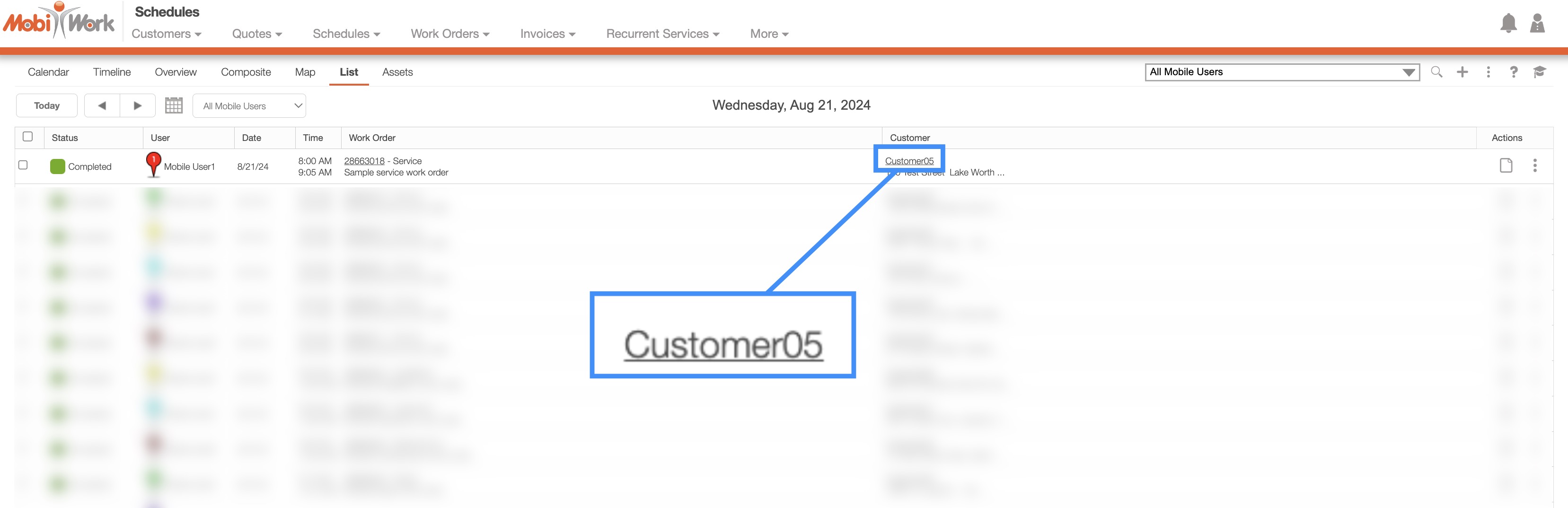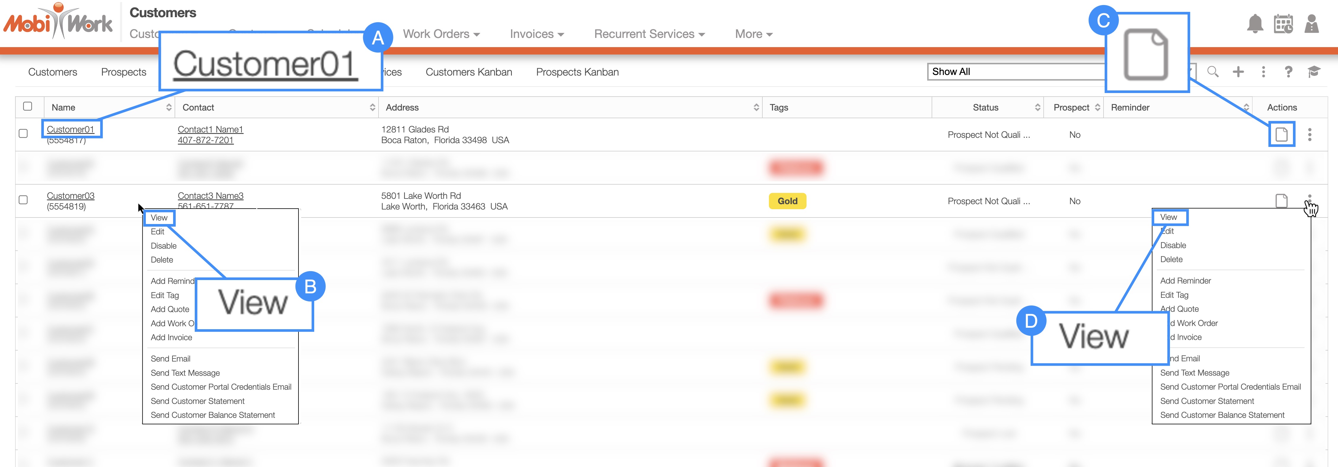 The following sections demonstrate some common methods of how to access the View Customer pop-up window from your MobiWork web platform: