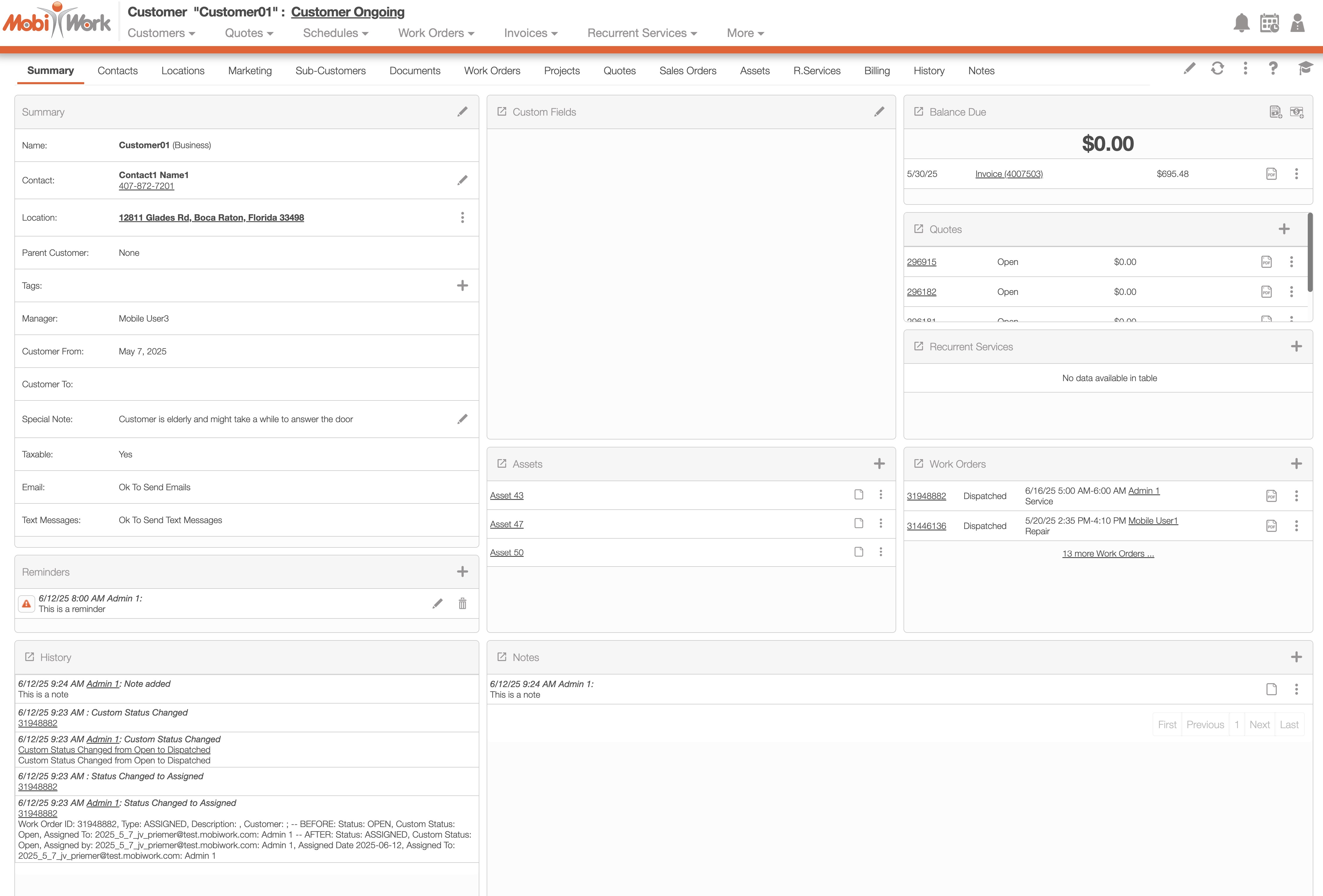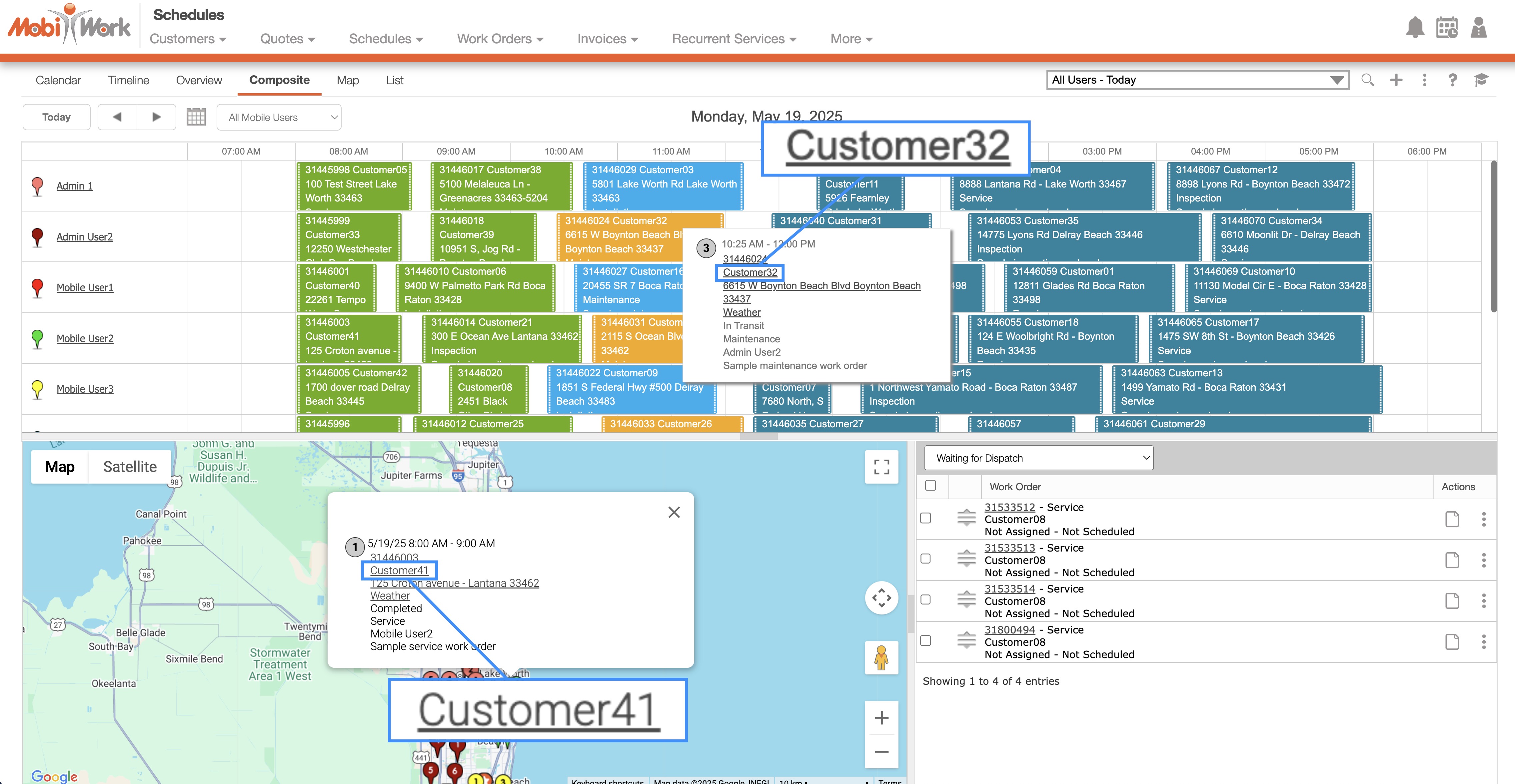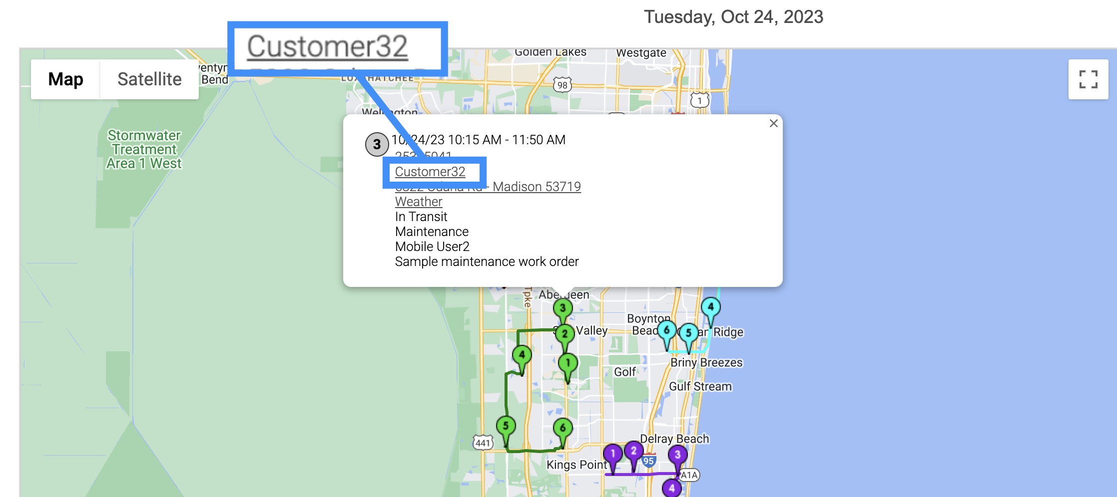 The following sections demonstrate some common methods of how to access the View Customer pop-up window from your MobiWork web platform: