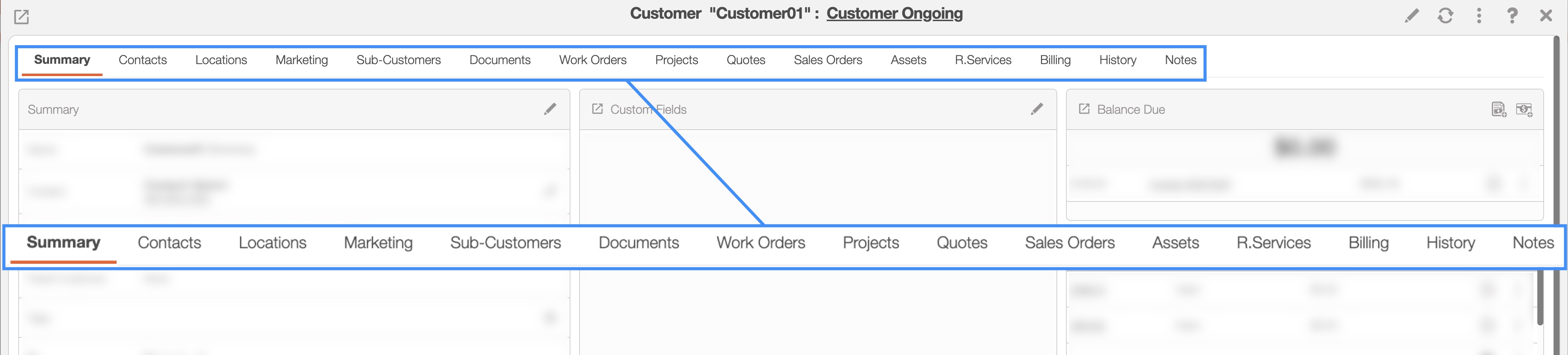 The full-size View Customer pop-up window can be seen below. All the tabs, buttons, and features are identical to how they would appear in the pop-up window: