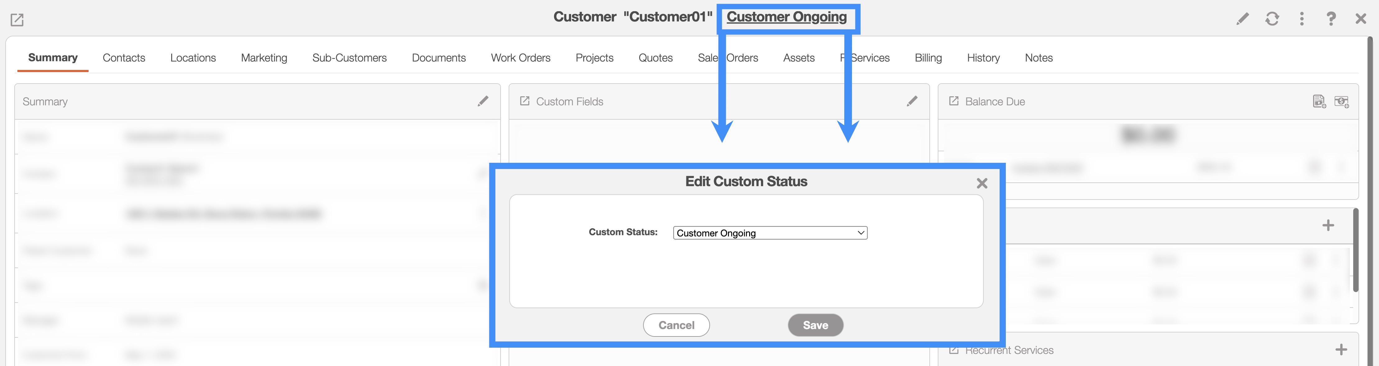 The customer's name and the status will be displayed towards the top of the View Customer pop-up window: