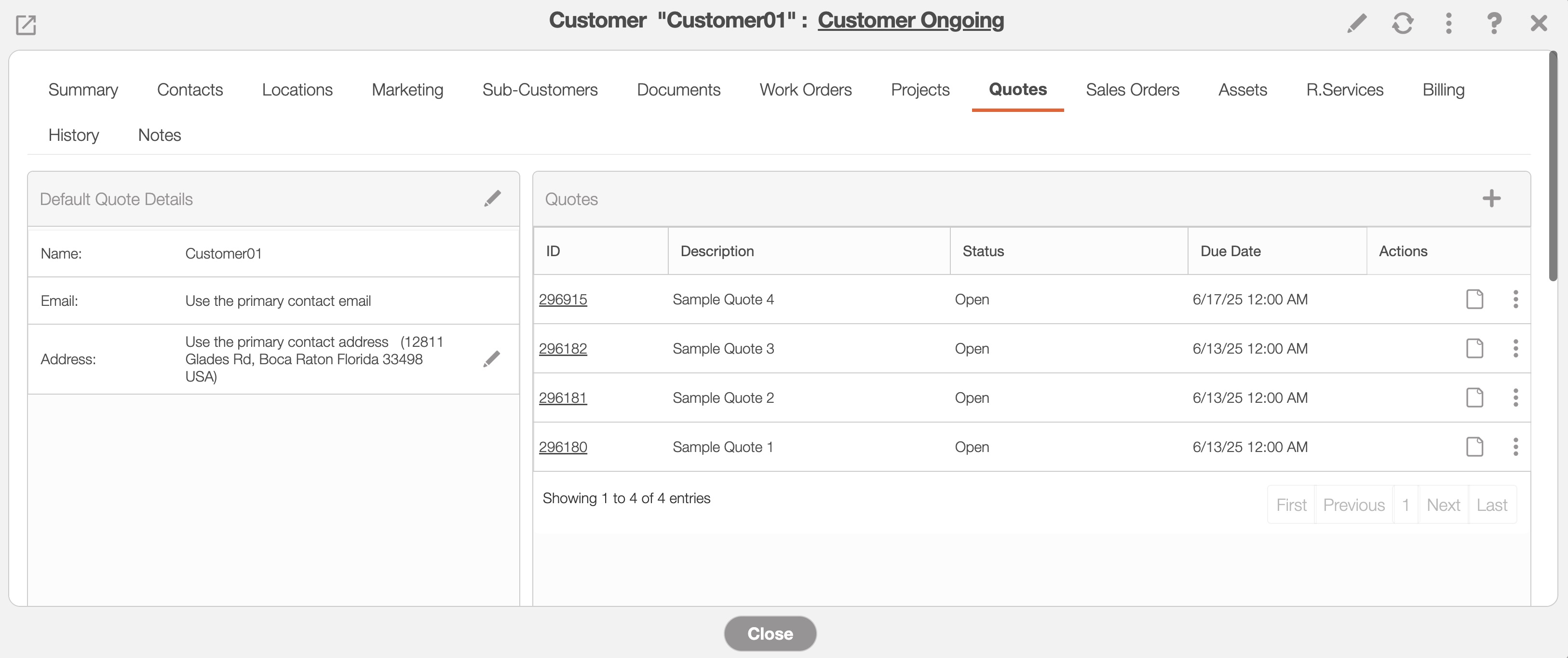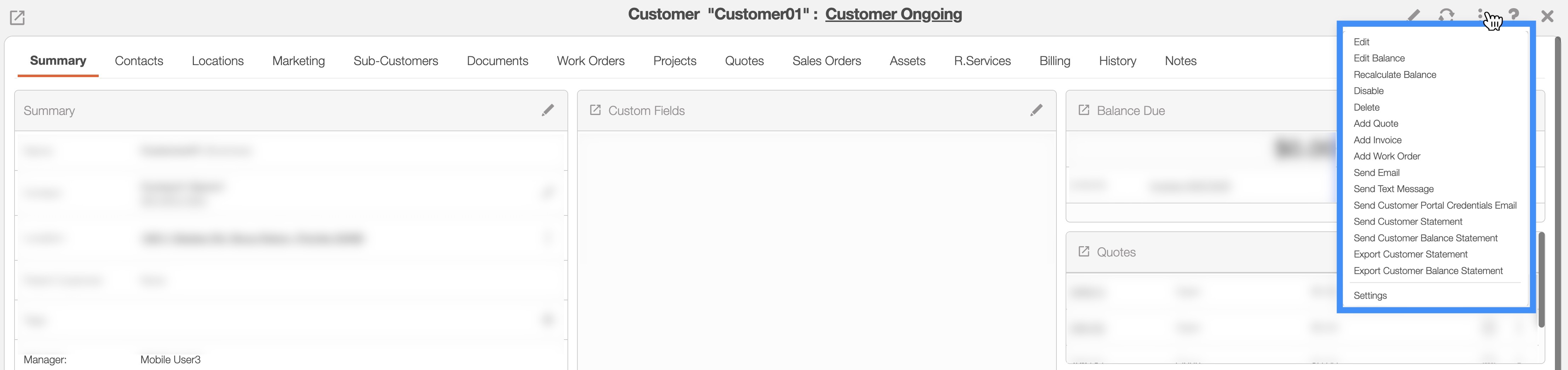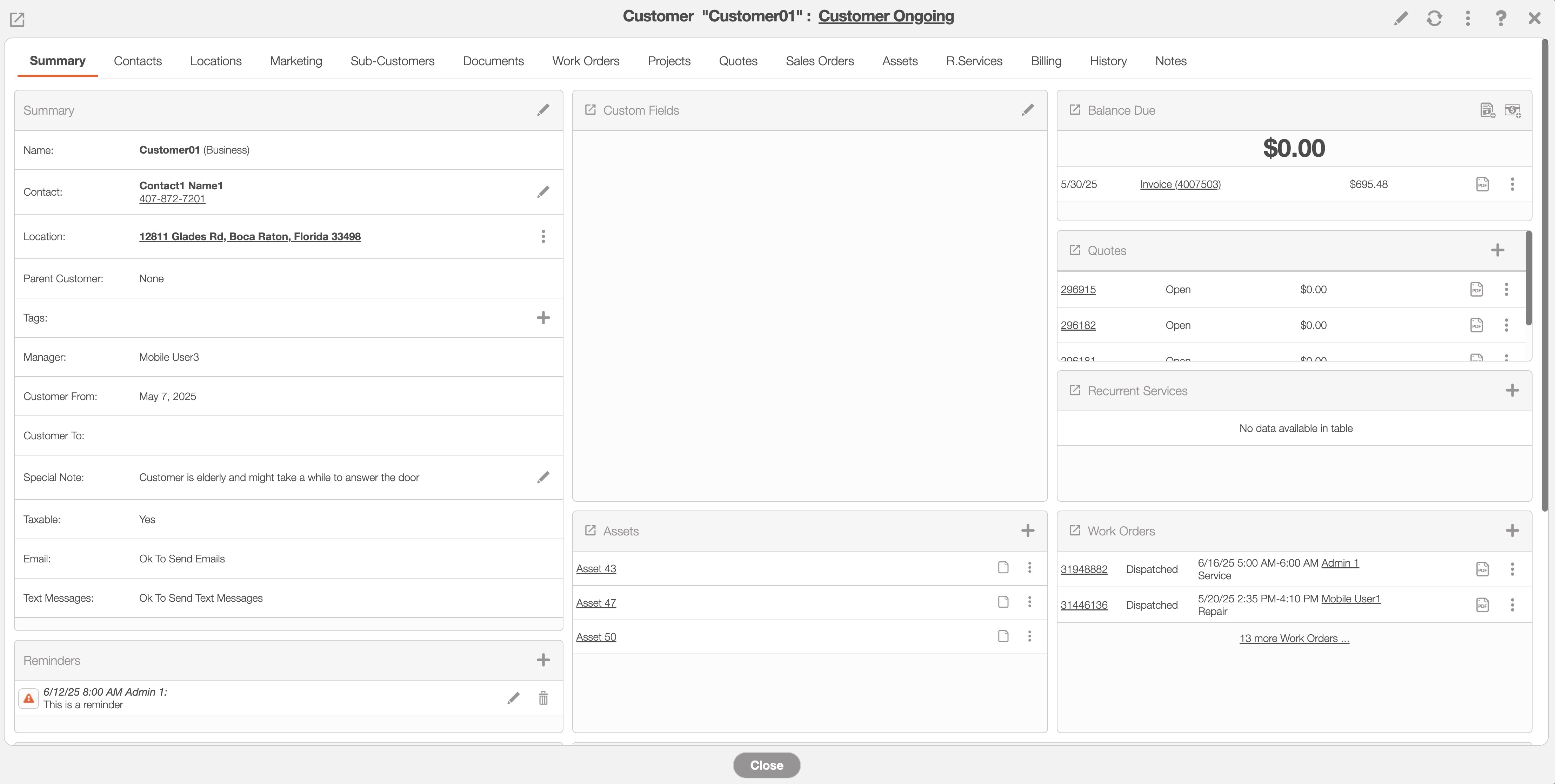 Unlock a wealth of customer information with just a single click. With the View Customer pop-up window, you will gain instant access to a comprehensive array of customer data, including contact details, parent customer information, billing data, invoices, quotes, work orders, and more. The View Customer pop-up window serves as a hub for effortlessly adding work orders, invoices, quotes, and more to enhance your customer interactions.