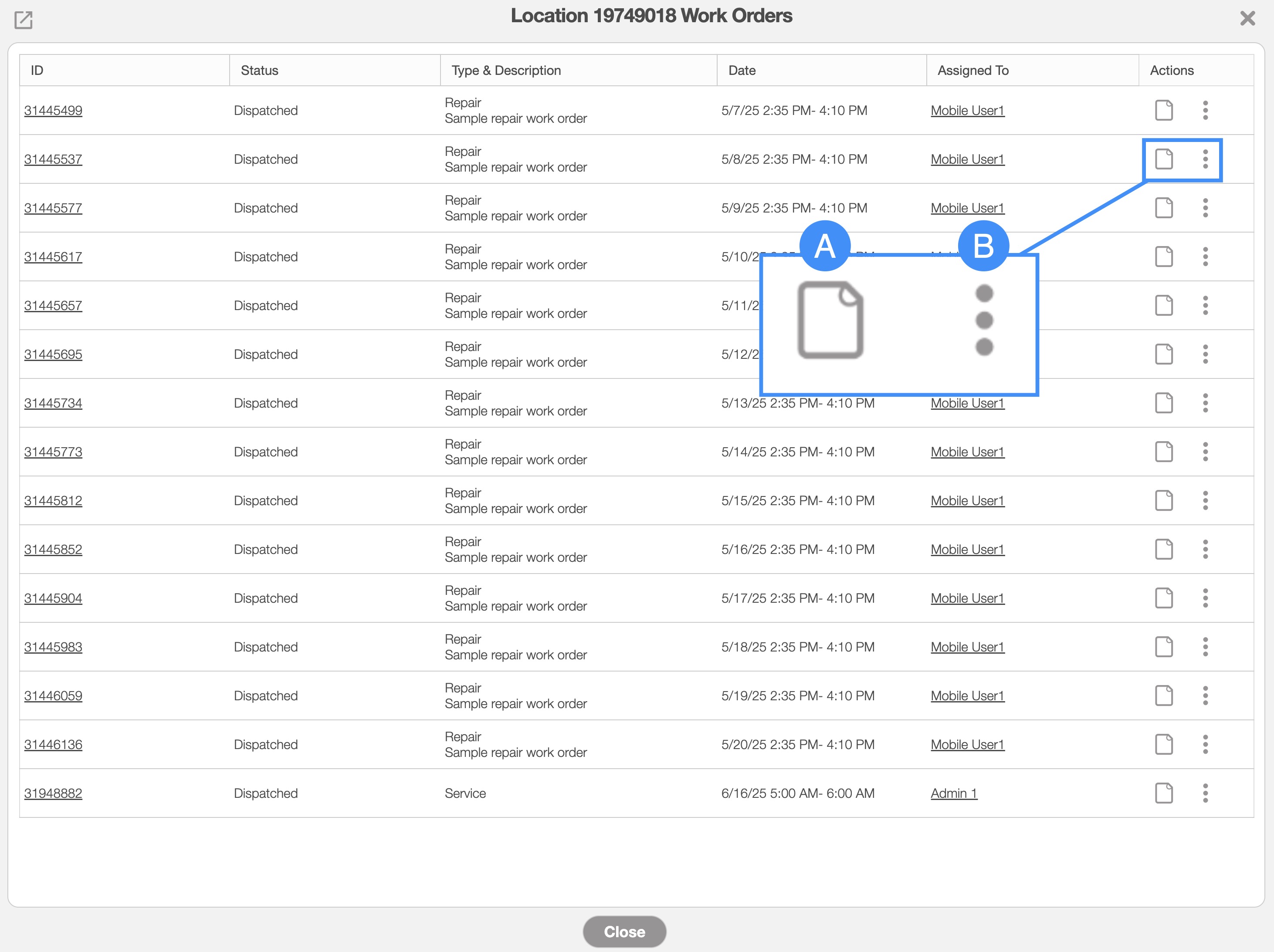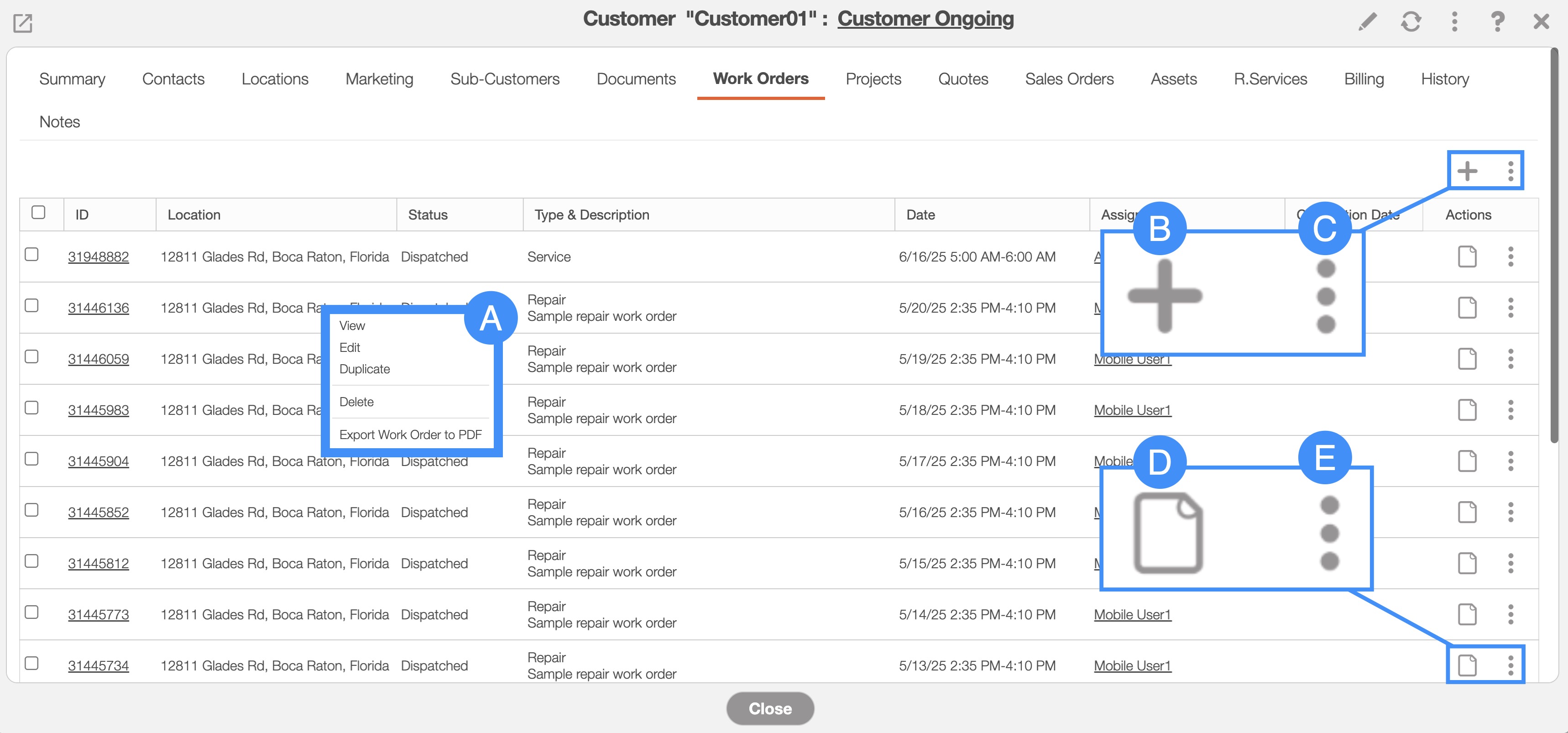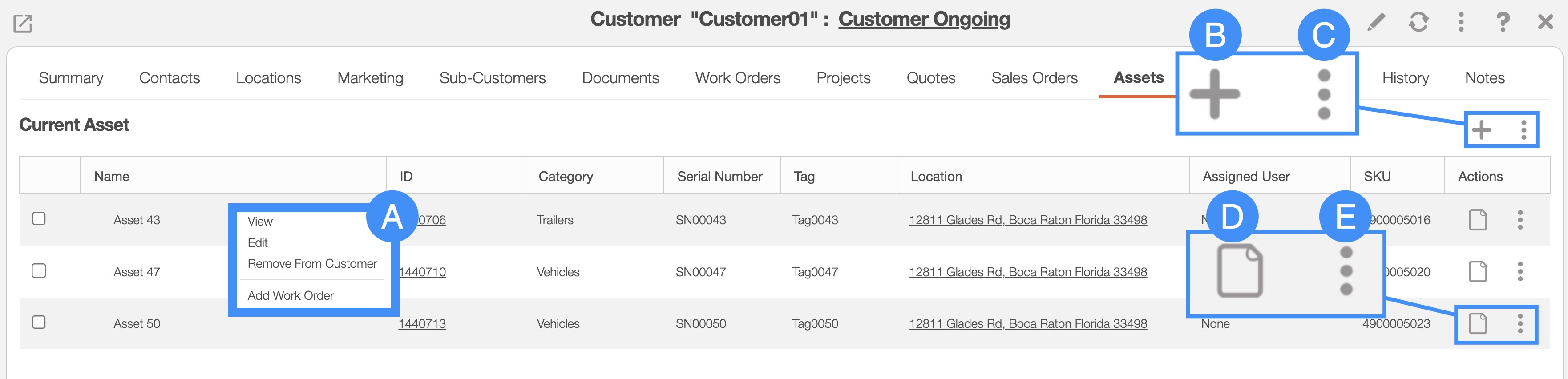 | "Actions" | Allows you to view, edit, remove the asset from the customer, or add a work order. |