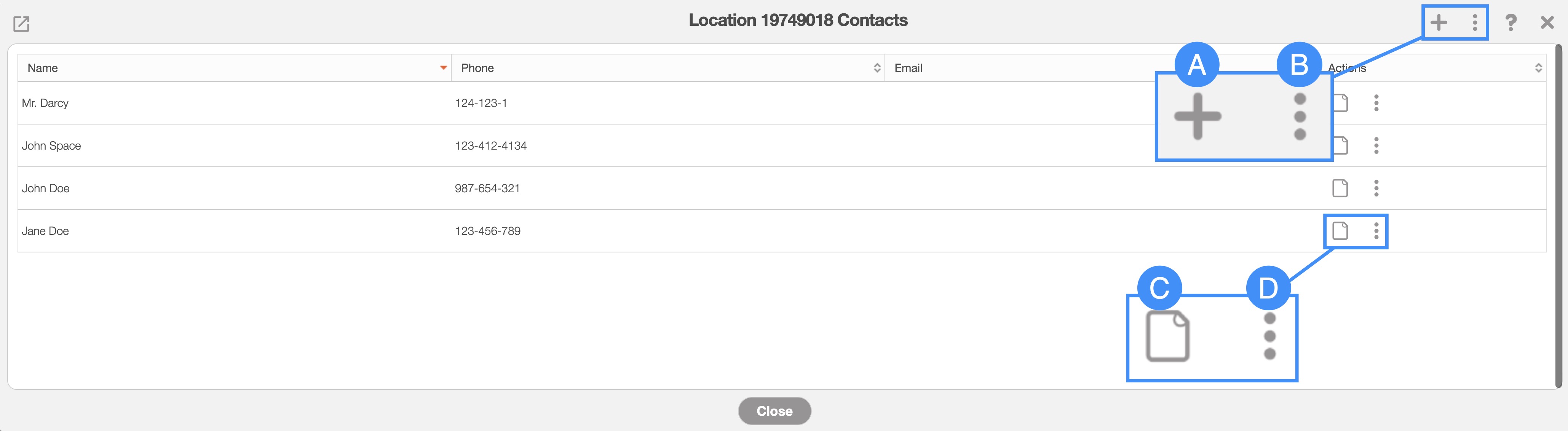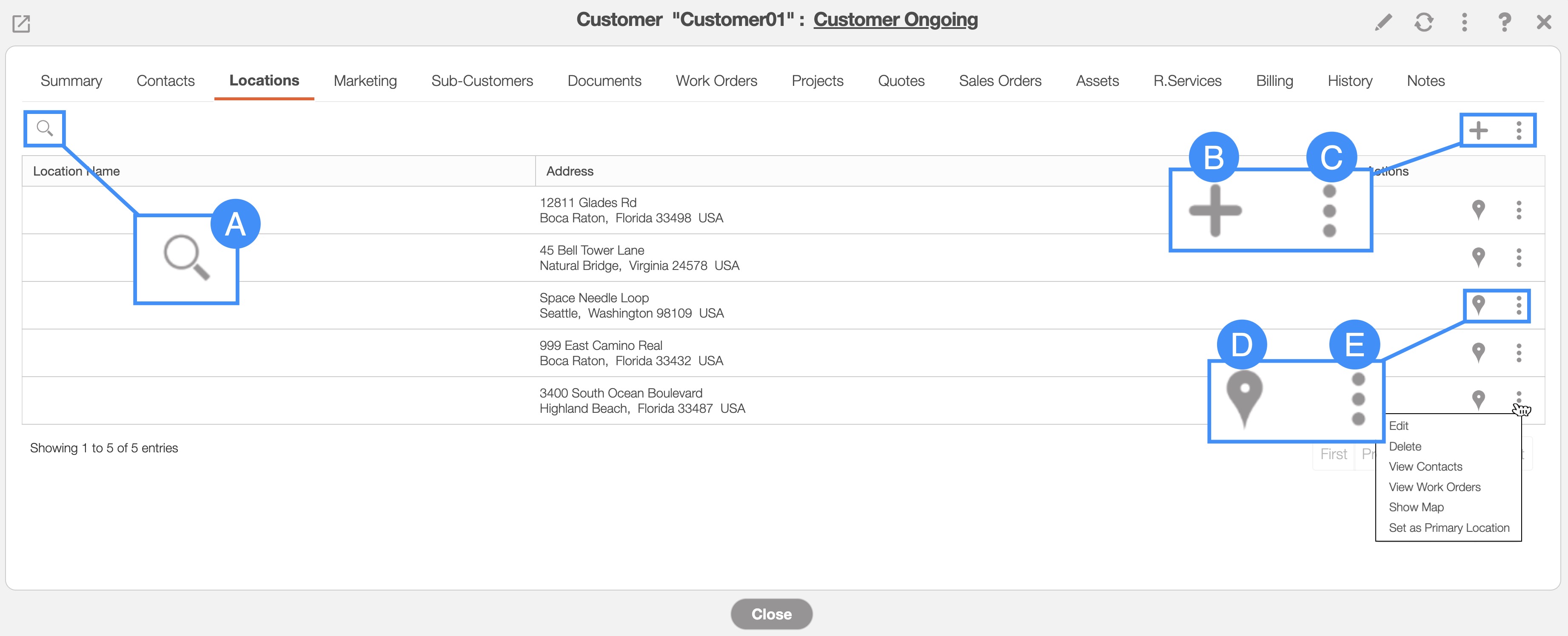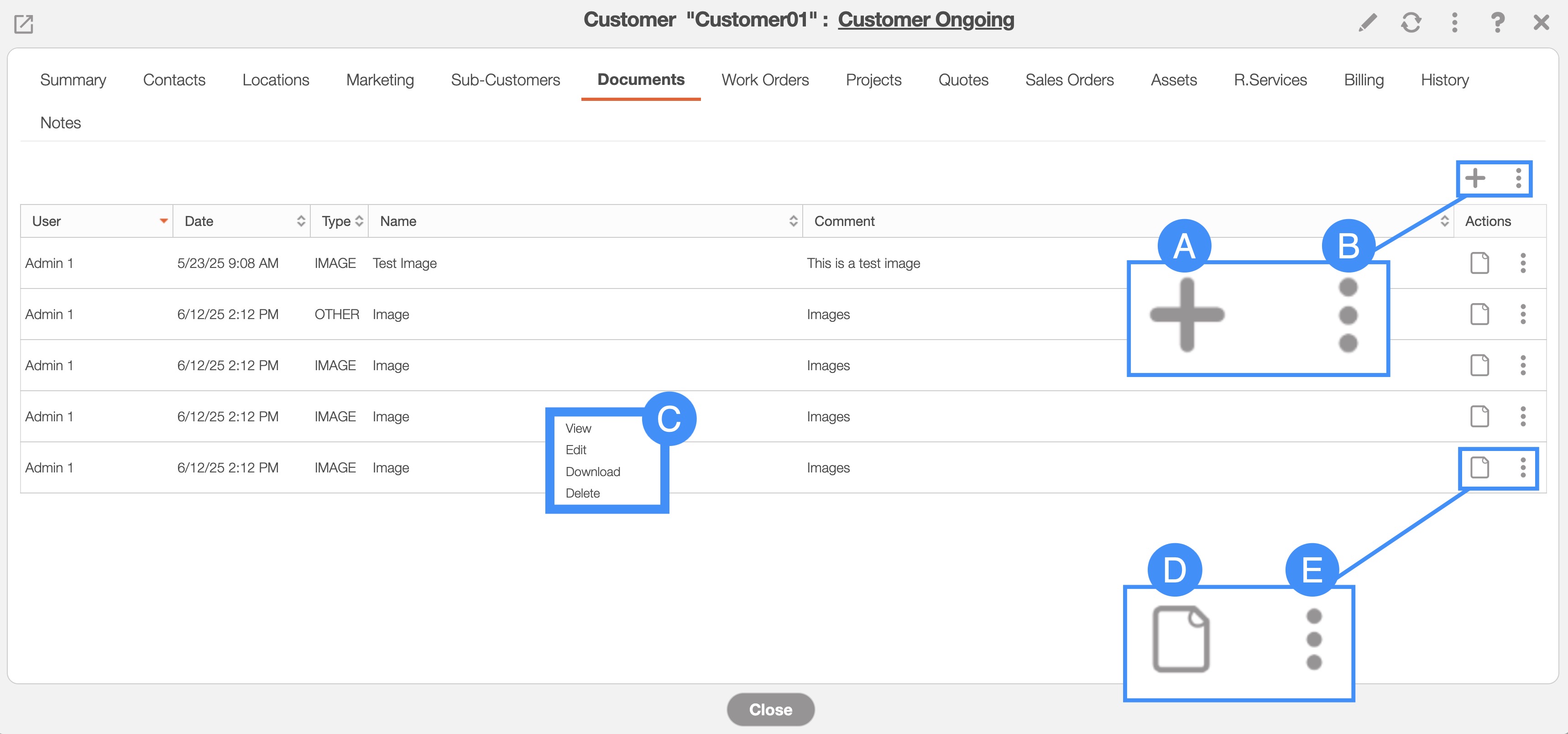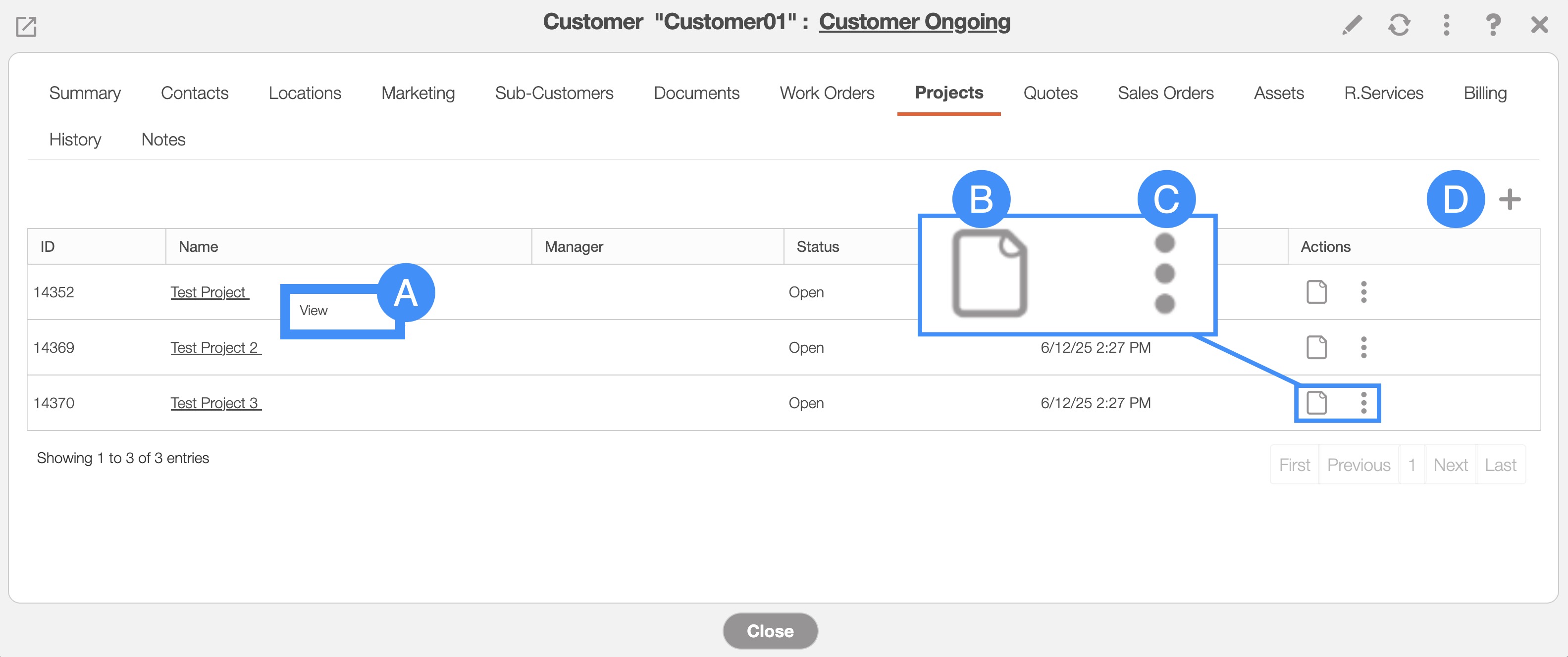 | "Actions" | Allows you to view, edit, remove the asset from the customer, or add a work order. |
