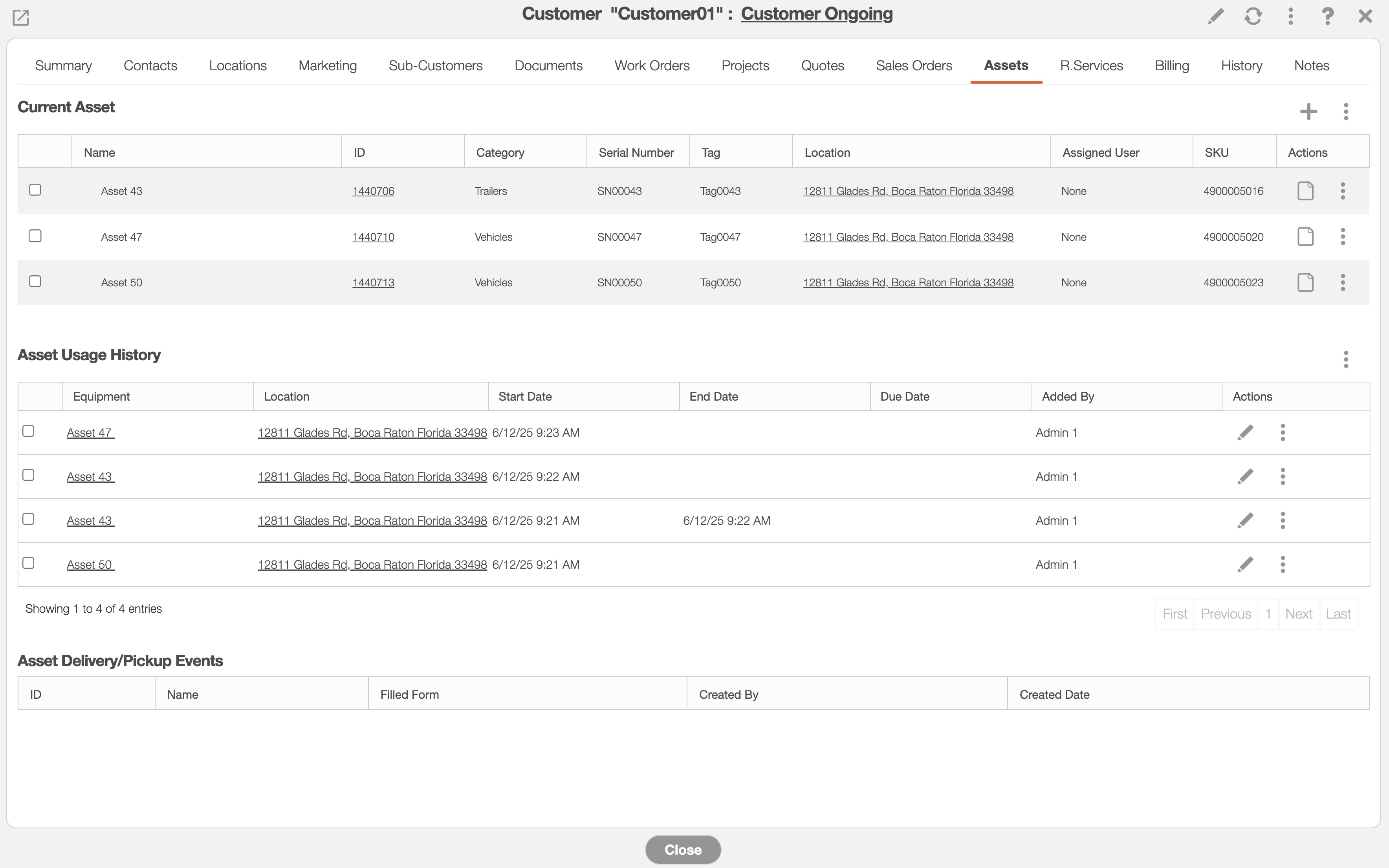 The "Asset Usage History" subsection will display the start and end dates of the assets that were associated with the customer.