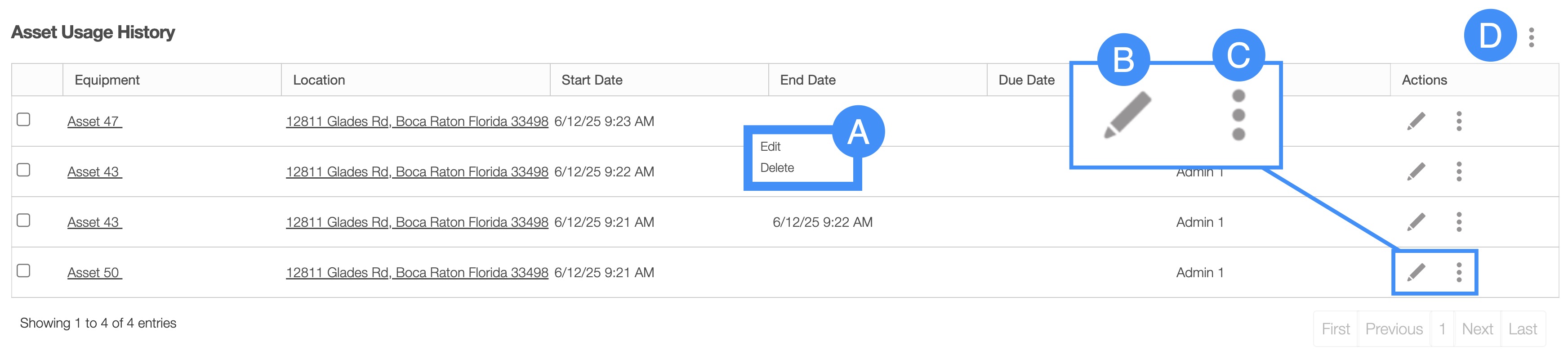 | "Actions" | Allows you to edit the installation or delete (remove) the asset from the customer's history. |