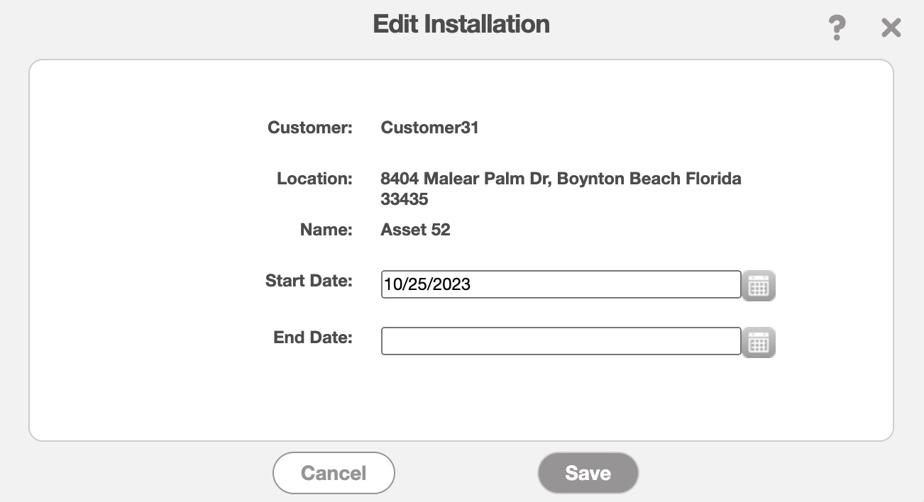 When you choose to edit the asset installation, the Edit Installation pop-up window will appear. In this pop-up window, you can update the start and end dates of the asset installation. Once you are satisfied with the dates, click the Save button:
