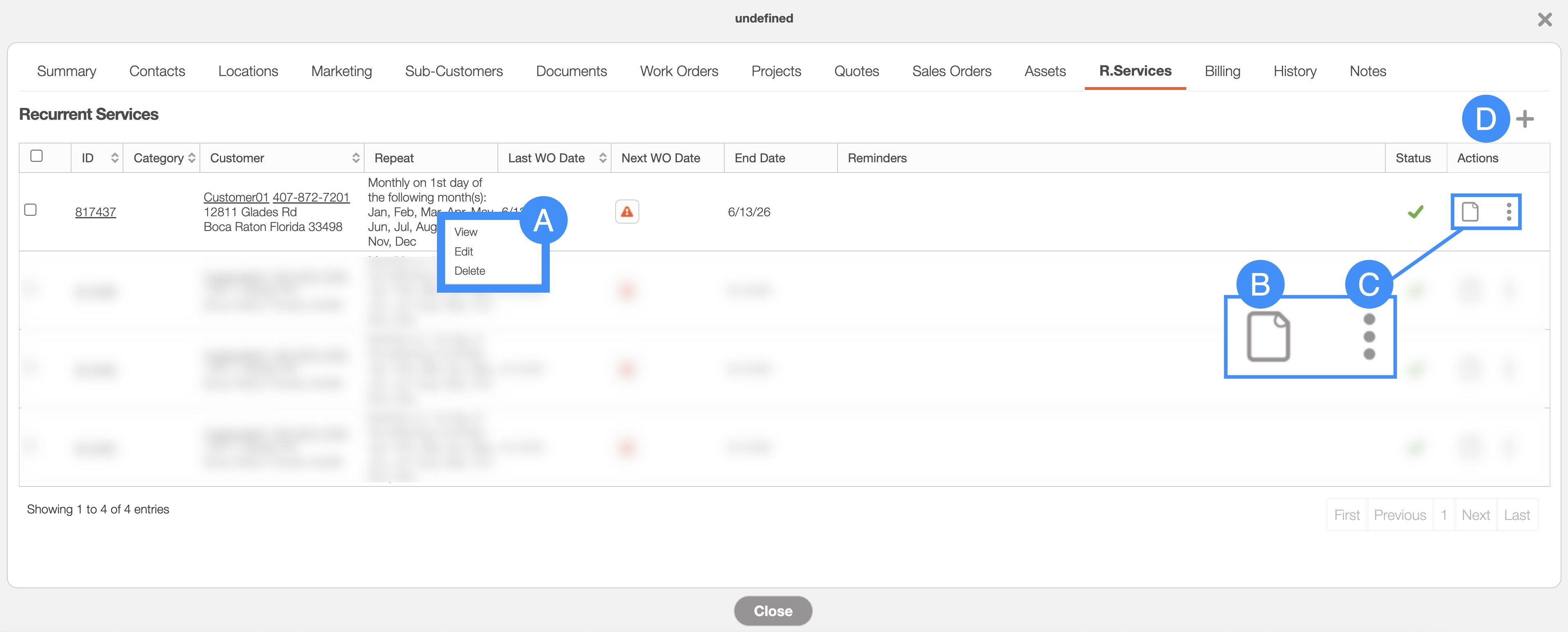 | "Actions" | Allows you to view, edit, edit the last service date, generate work order, or delete the recurrent service. |