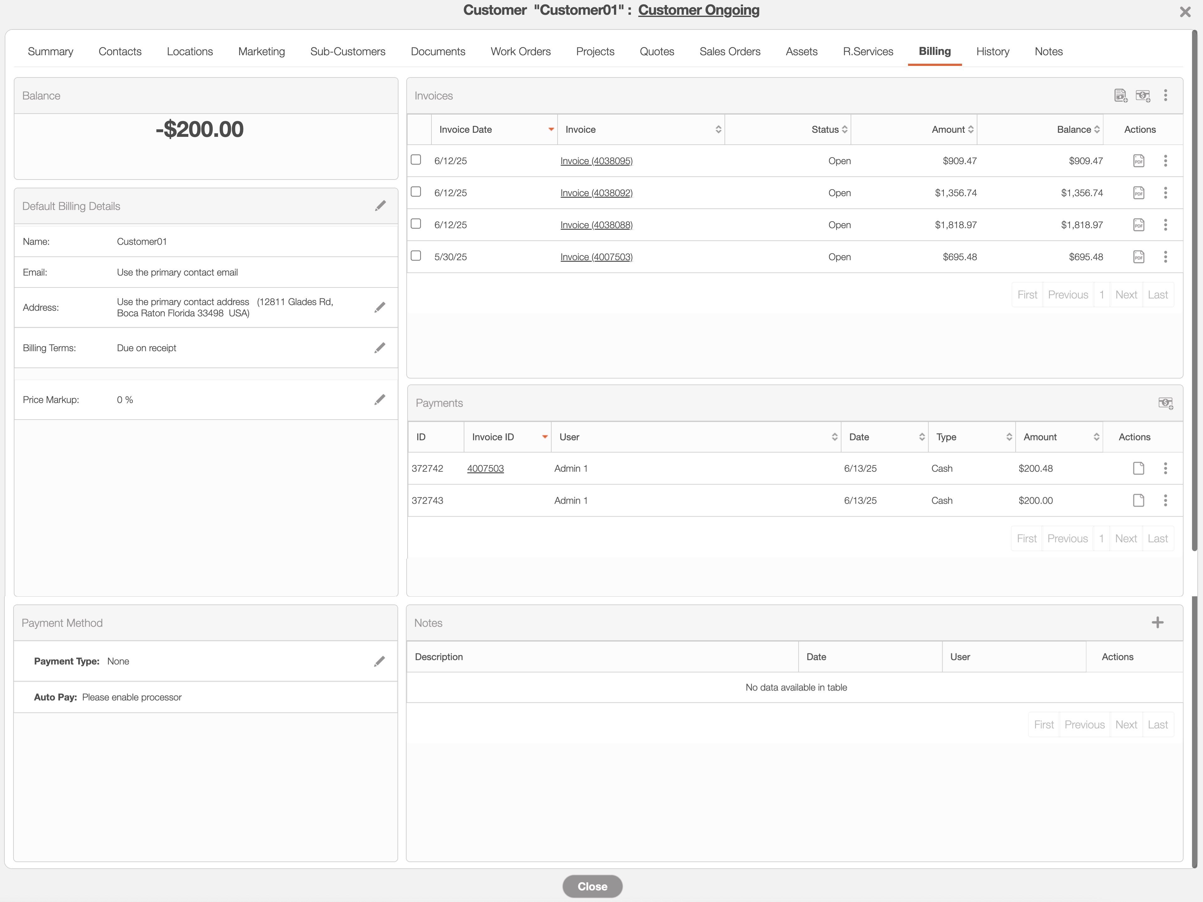 The "Billing" tab will display the billing information of the customer; this will include the balance, when the invoice was created, any notes involved regarding the invoice, and more: