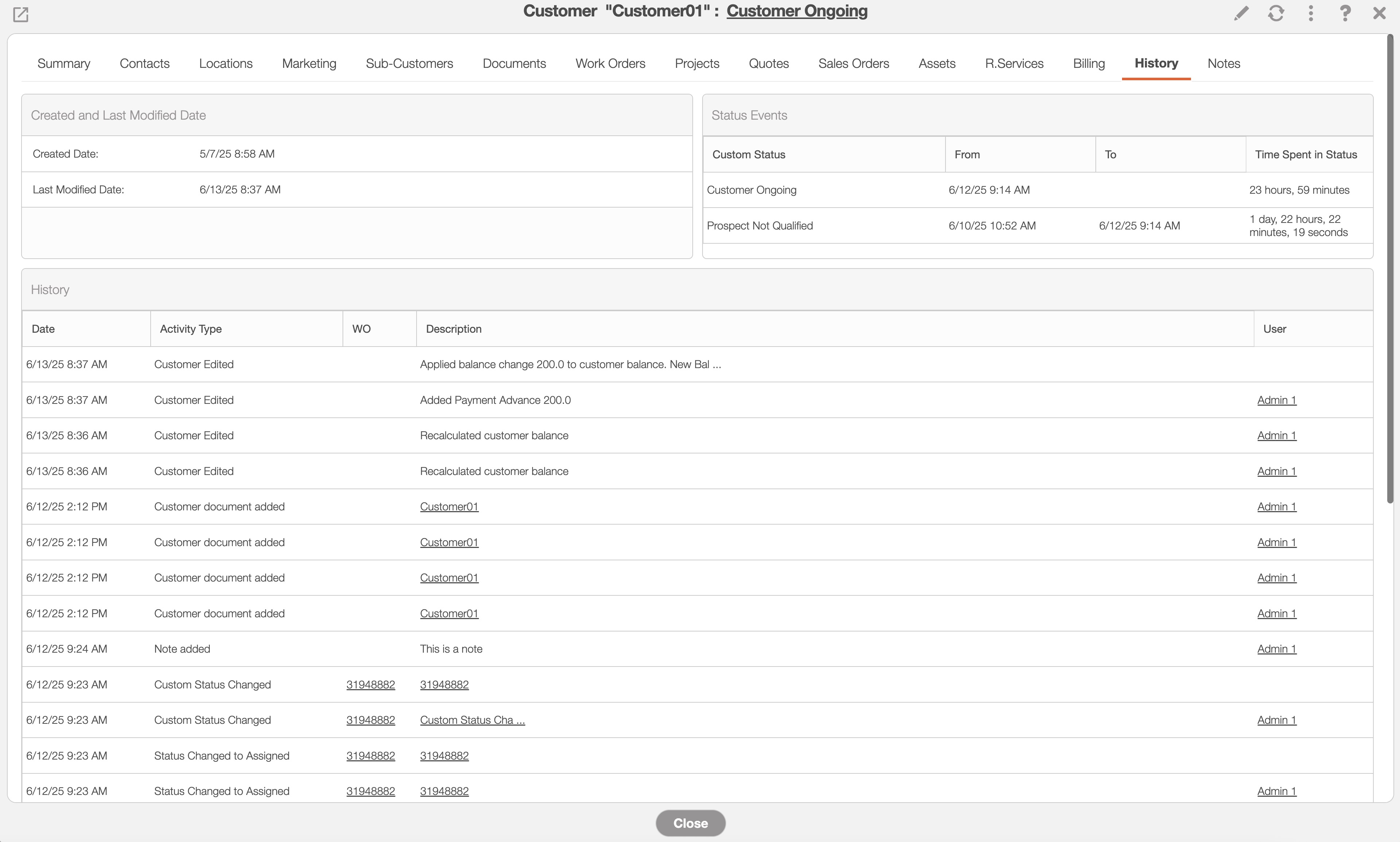The "History" panel will display all the historical related data associated with the customer profile; this includes statuses, assigned work orders, invoices, and more.