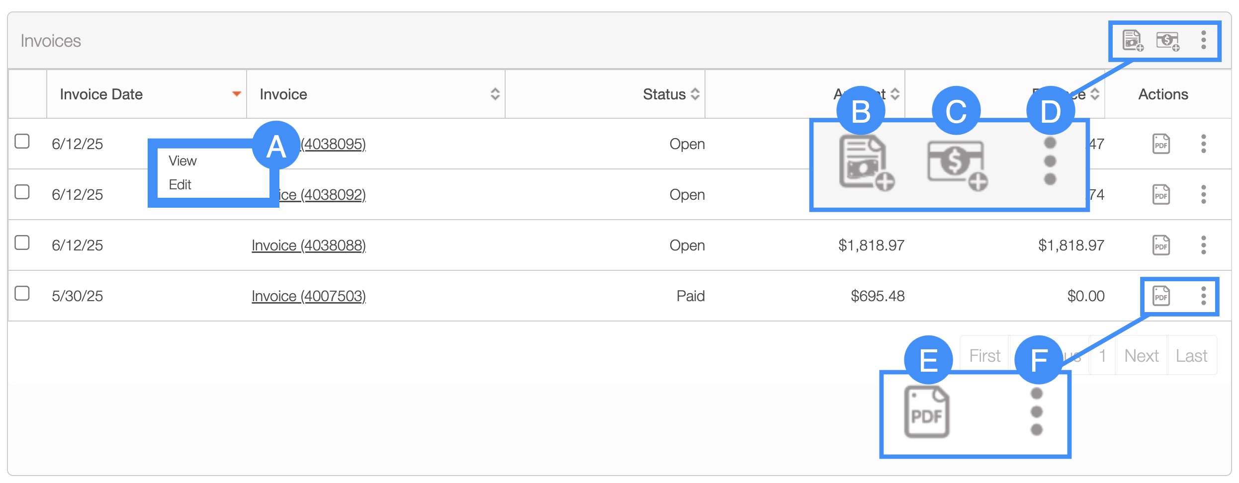 | "Actions" | The "Actions" column has the PDF button which will allow you to download a PDF copy of the invoice. The Individual Actions located in this column will allow you to access the "View" or "Edit" options for the selected invoice. |