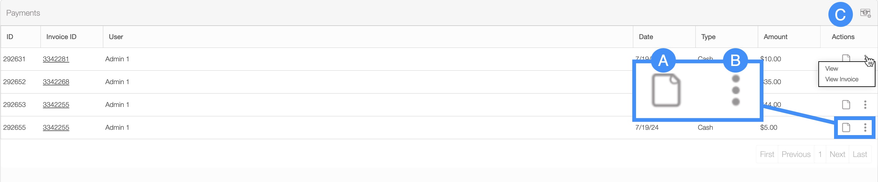 The Individual Actions will allow you to access the View Payment pop-up window or the View Invoice pop-up window.