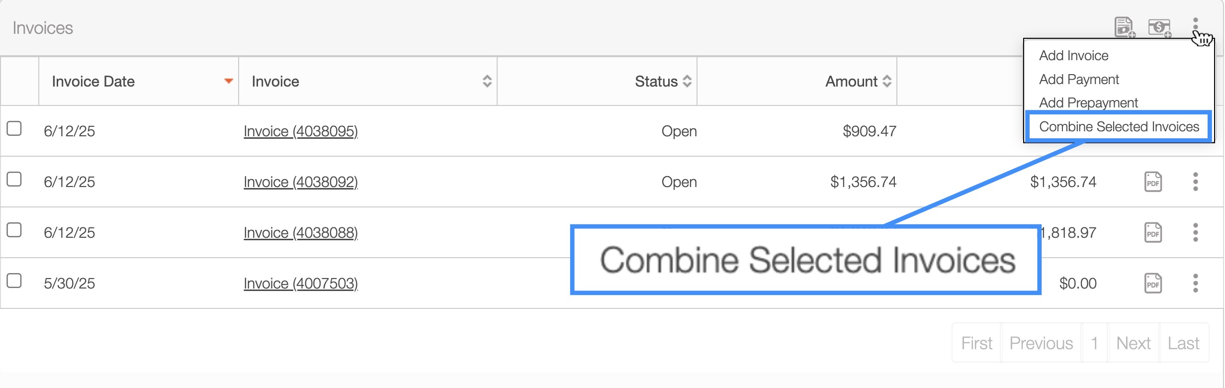 The More Actions button, will allow you to add an invoice, add payment to a selected invoice, add a prepayment, or combine selected invoices.