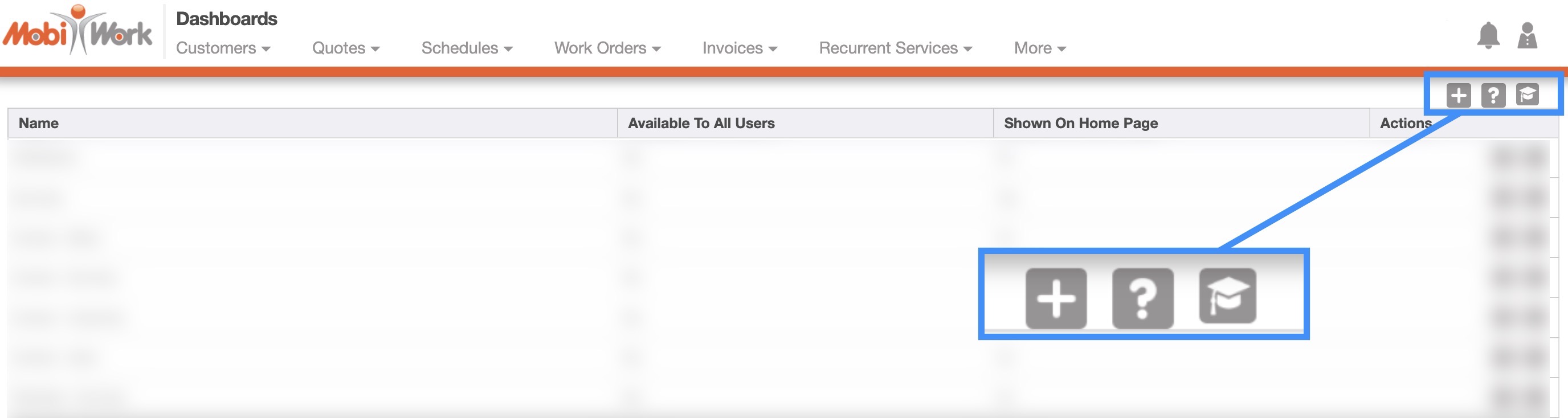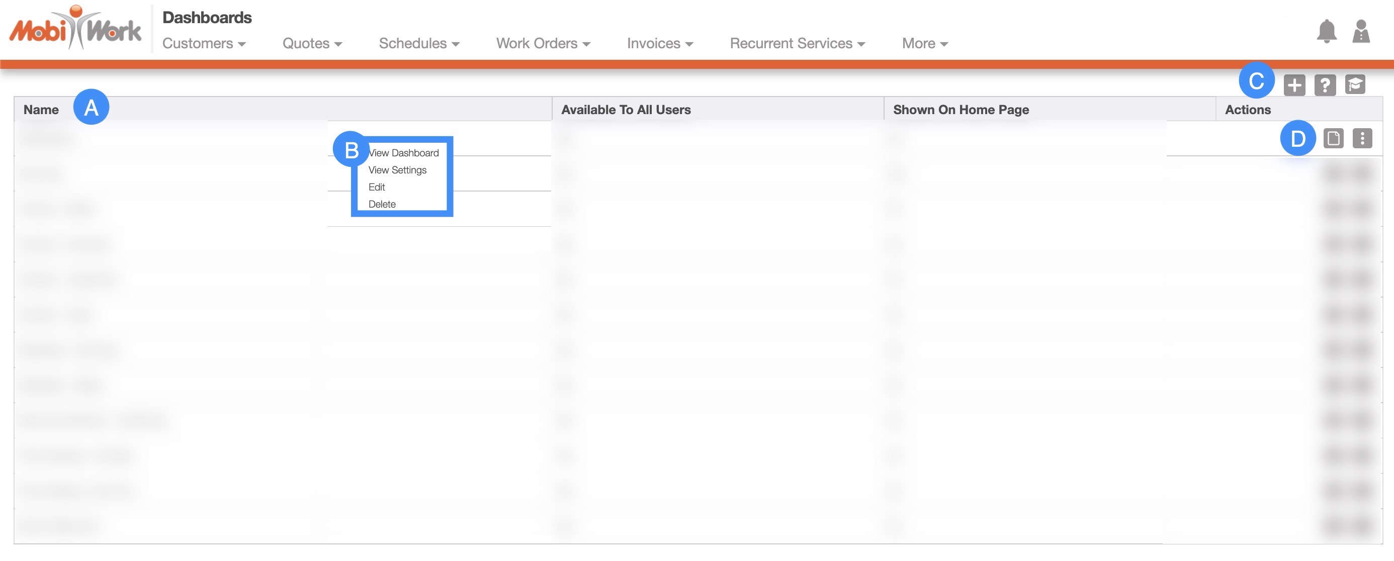 The Dashboards feature page is the default page you will be brought to once you access the Dashboards feature. Please note that when you first access your MobiWork account, you will already have several preconfigured dashboards ready for you to use.