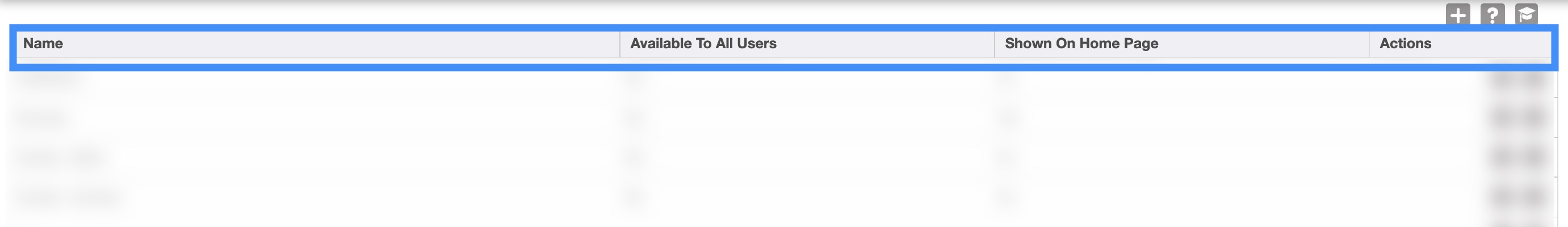 These columns are organized as: "Name," "Available To All Users," "Shown On Home Page," and "Actions:"
