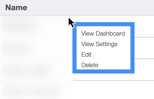 When selecting a dashboard and clicking on the Individual Actions button (the three vertical dots under the "Actions" column) you will be able to view the settings (dashboard panel), view the dashboard display, edit, or delete the selected dashboard.