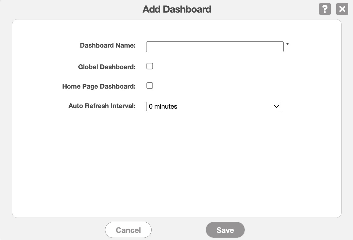 | "Global Dashboard" | If checked, the dashboard will be available to all users. If unchecked, the dashboard will only be available to you. |