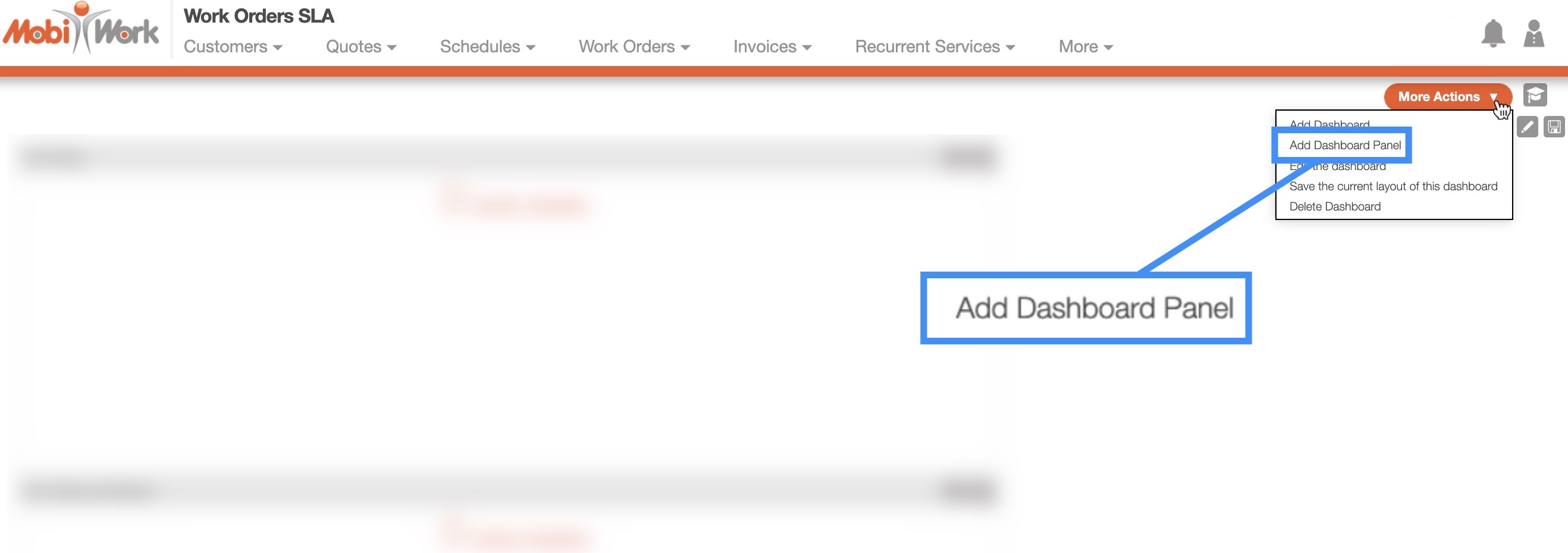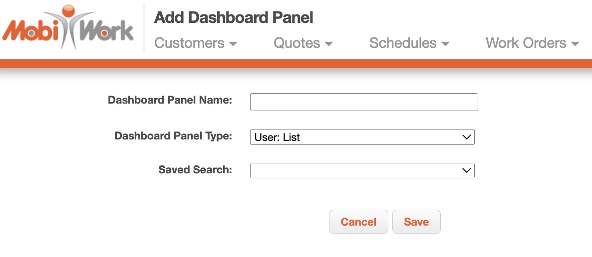 Once you add a new dashboard, you can populate it with dashboard panels. Dashboard panels will display data from the specified MobiWork features.