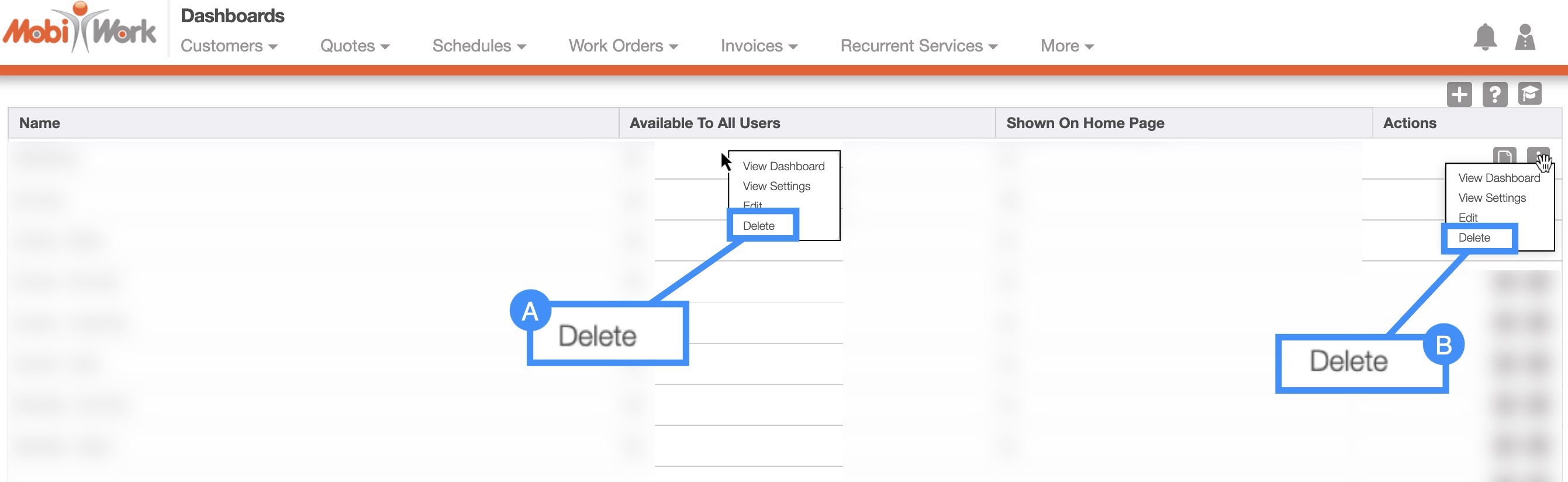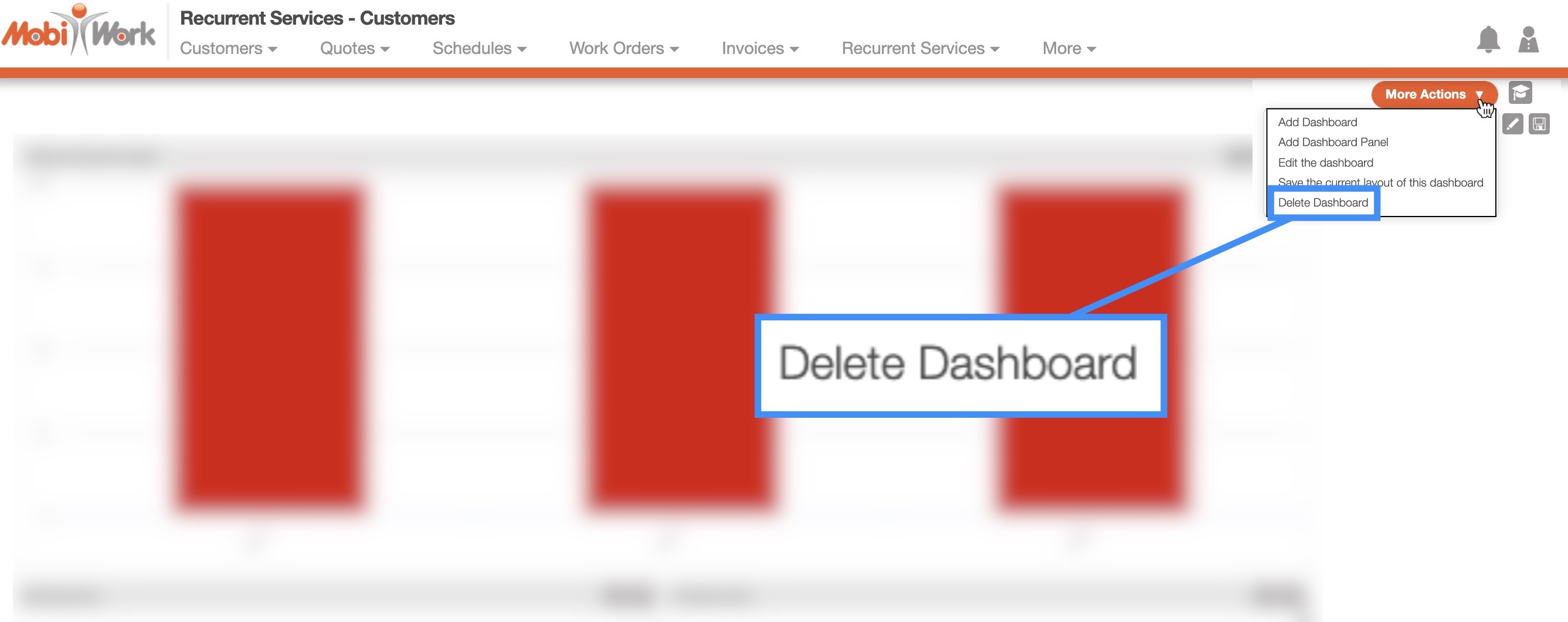 There are several different ways you can delete your dashboard in MobiWork; the following sections will illustrate how to access these options from your MobiWork web platform.