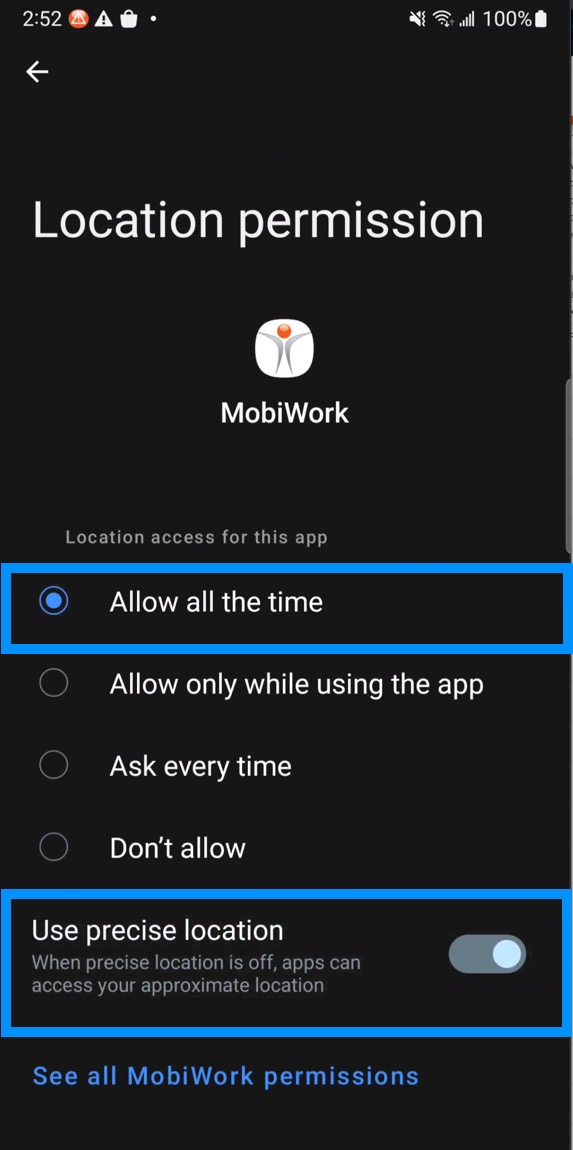 Once you are on "Location Permission" page, please change permissions to "Allow all the time" and toggle the "Use Precise Location" switch to on: