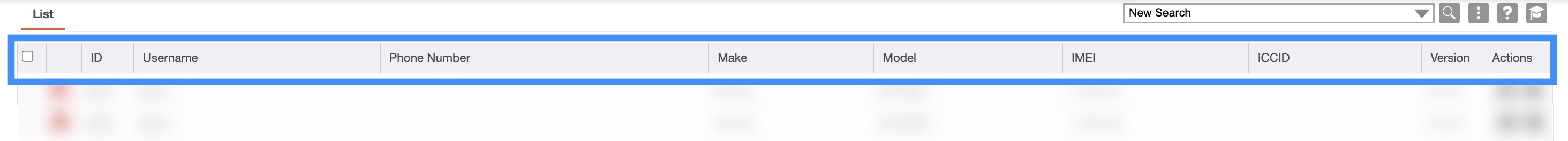 These columns are organized as: "ID," "Username," "Phone Number," "Make," "Model," "IMEI," "ICCID," "Version," and "Actions:"