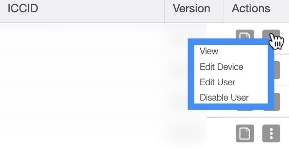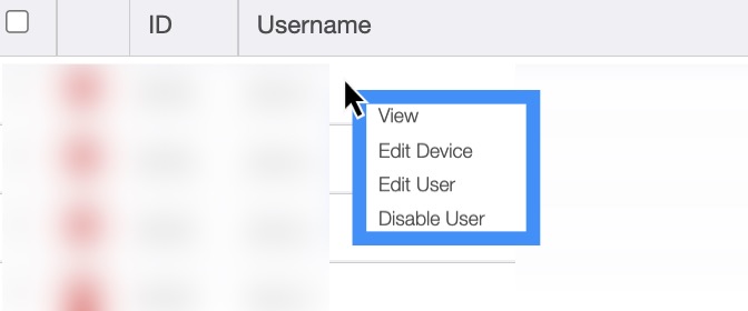 When selecting a device and clicking on the Individual Actions button (the three vertical dots under the "Actions" column) you will be able to view, edit the device, edit the user, or disable the selected user.