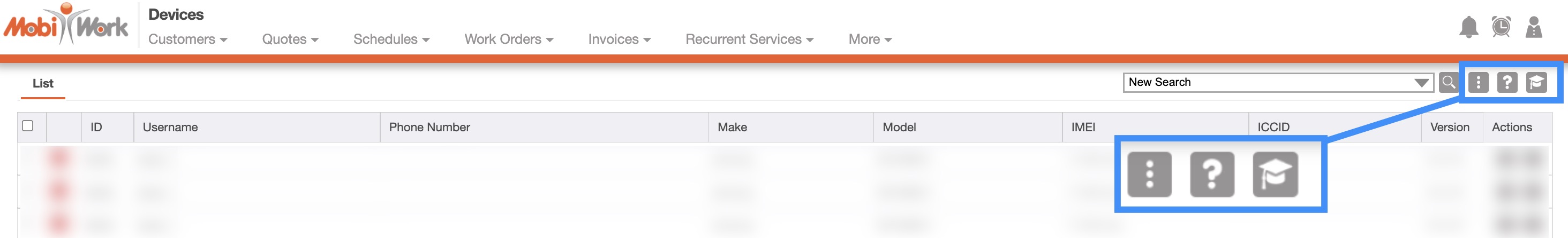 | "Actions" | The View icon and the Individual Actions button can be found here; these buttons will allow you to perform actions on a device or the user associated with the device. |