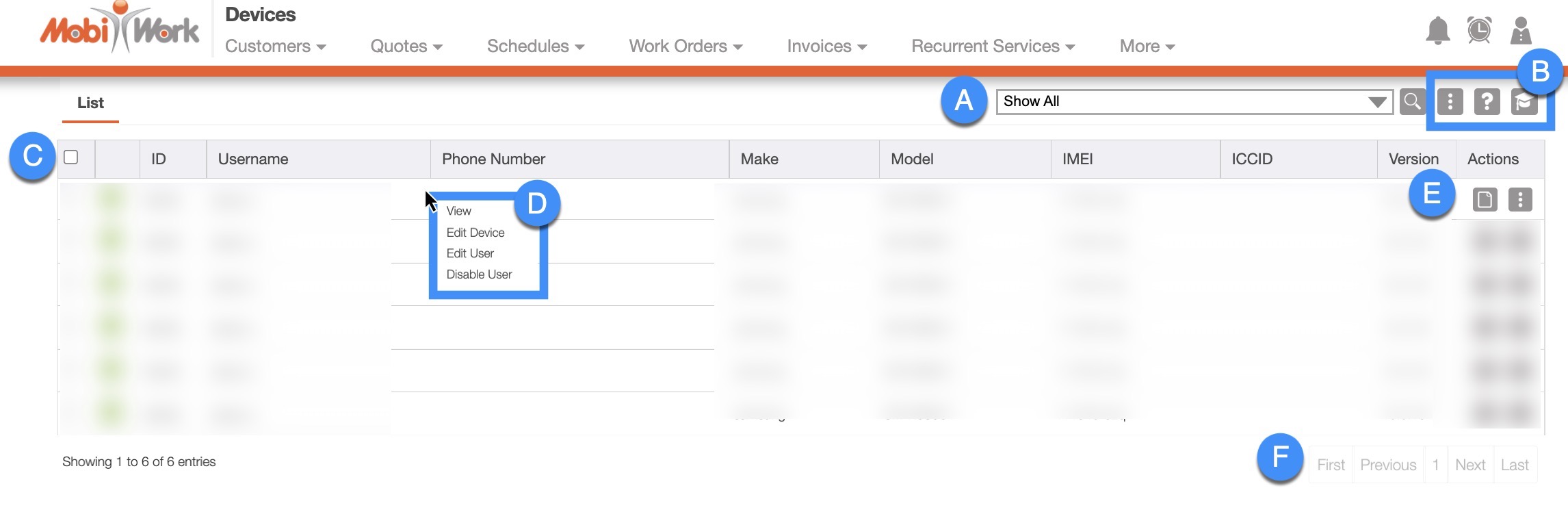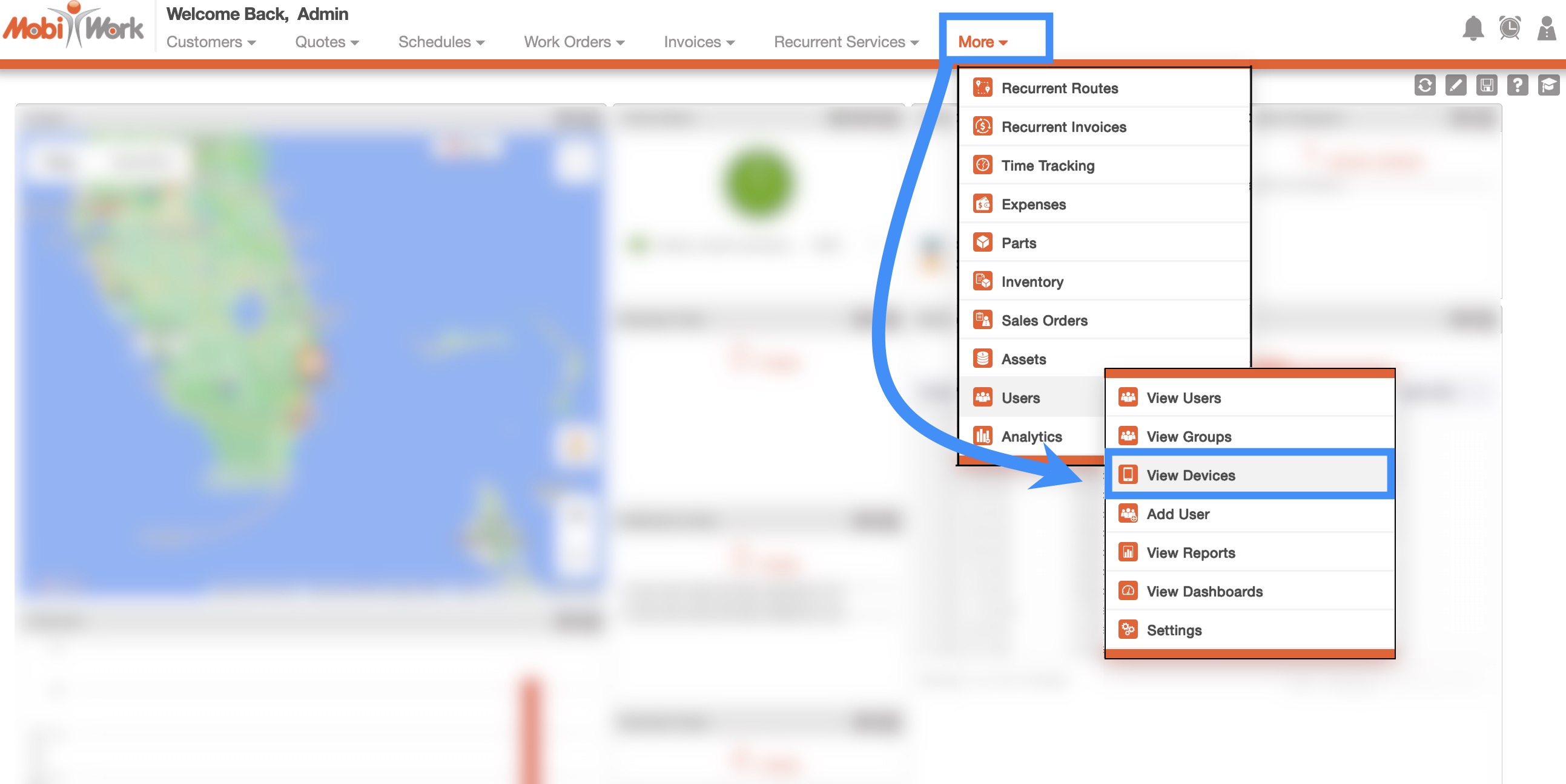 Hovering over the Users feature from your MobiWork menu and clicking on the "View Devices" option: