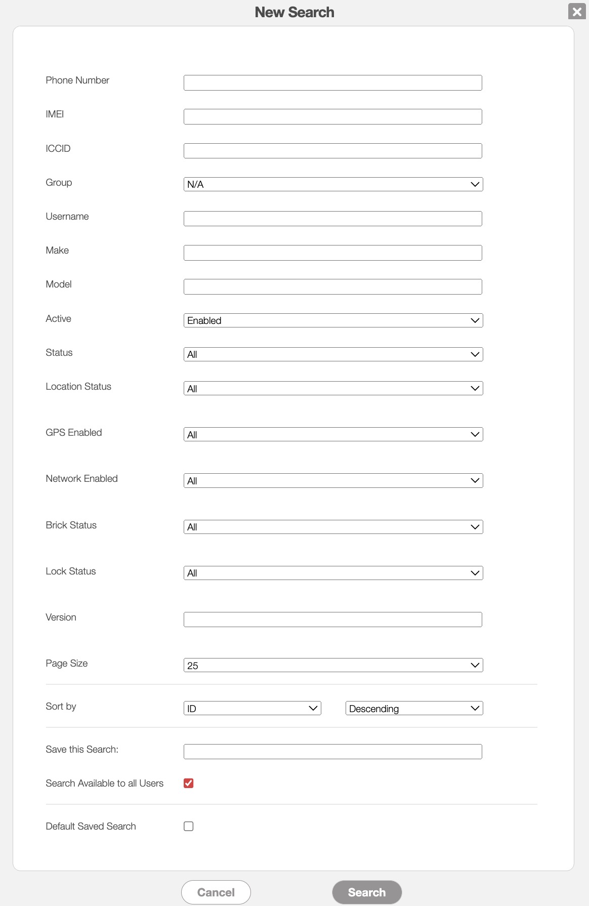 | "Sort By" | Sorts your search in ascending or descending order by: ID, Make, Model, Username, or Last Update Time. |