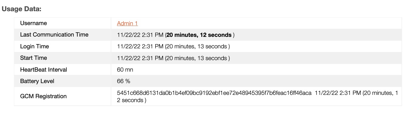 The "Usage Data" is the second section of the "Summary" tab. It contains the user information and usage of the selected device including the username, login time, battery level, and more.